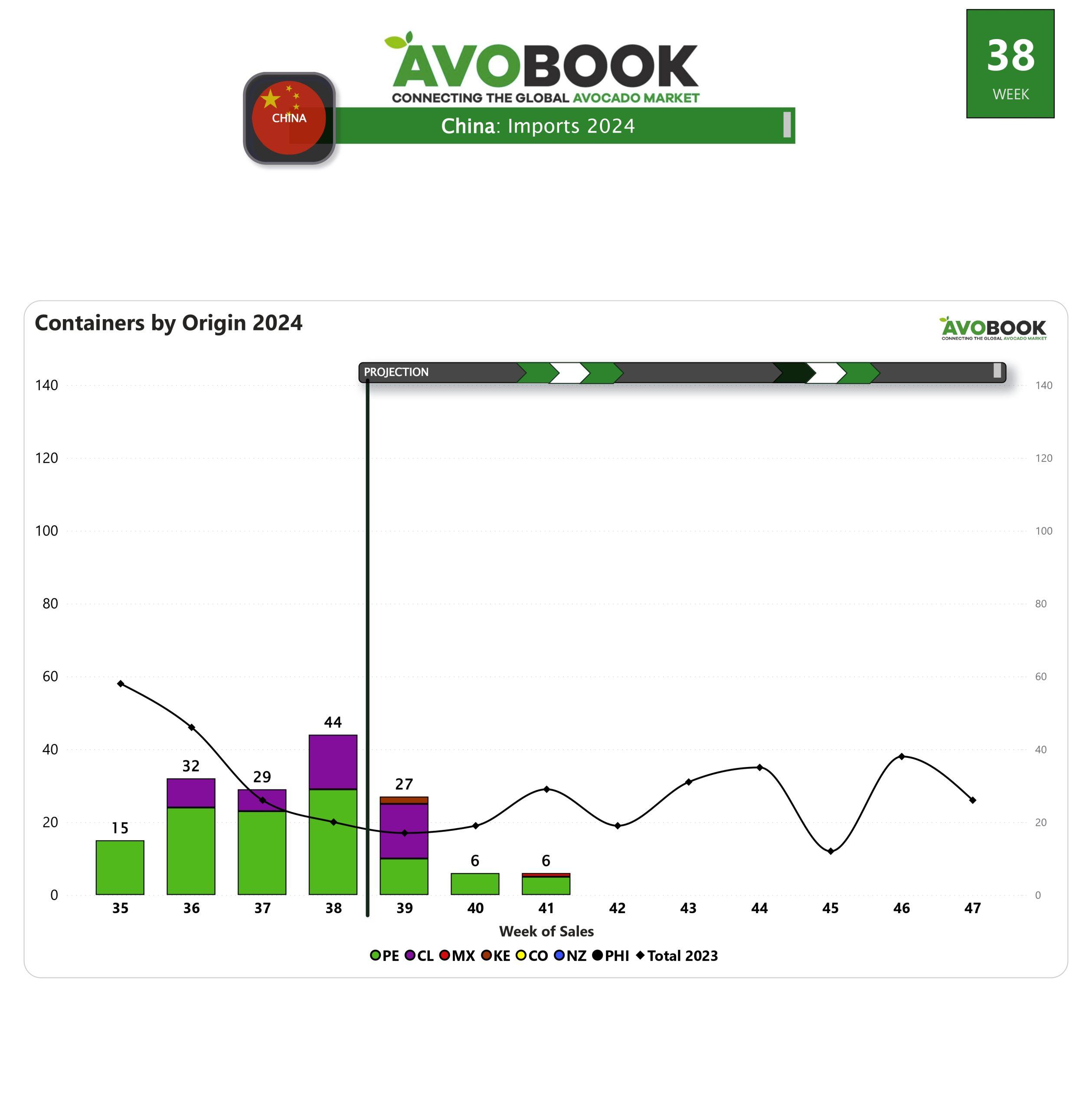 Perú y Chile son los dos orígenes que abastecen el mercado chino durante la semana 38, con 44 envíos, representando un 52% de alza, en comparación a la semana pasada. Dos tercios de ellos corresponden a fruta peruana, mientras el resto es de aguacate chileno. Es un buen volumen comparado con las últimas cuatro semanas, donde no se habían superado los 40 contenedores.