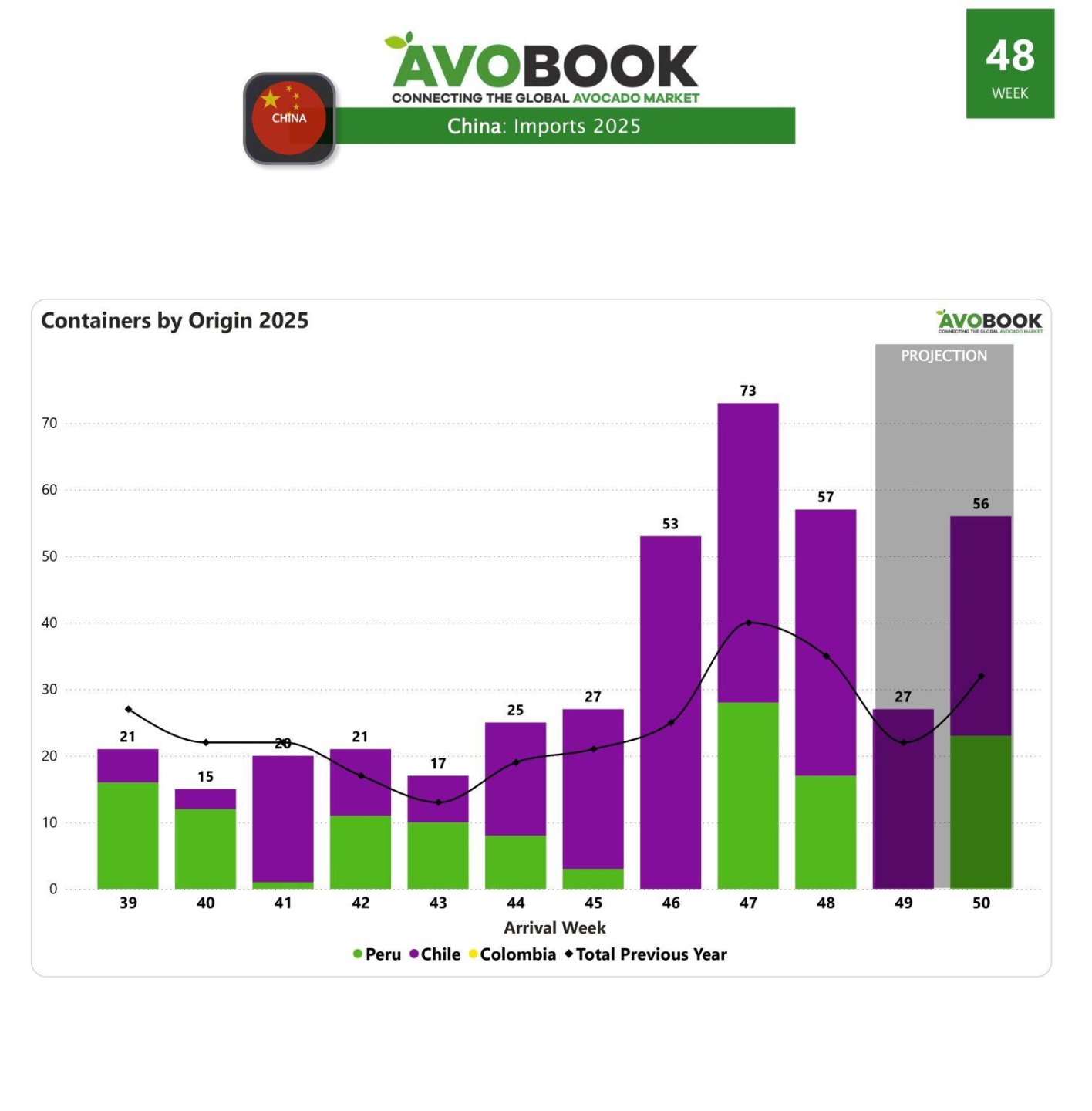 El mercado chino del aguacate registró en la semana 48 un total de 57 embarques, cifra que representa una disminución del 22% respecto de la semana anterior. Aun así, el nivel de oferta se ubicó un 63% por encima del registrado en la misma semana del año pasado. La fruta provino mayoritariamente desde Chile, que aportó el 70% del total, mientras que Perú completó el 30% restante. En comparación semanal, Perú fue el origen que más retrocedió, con una caída del 39% en sus envíos.