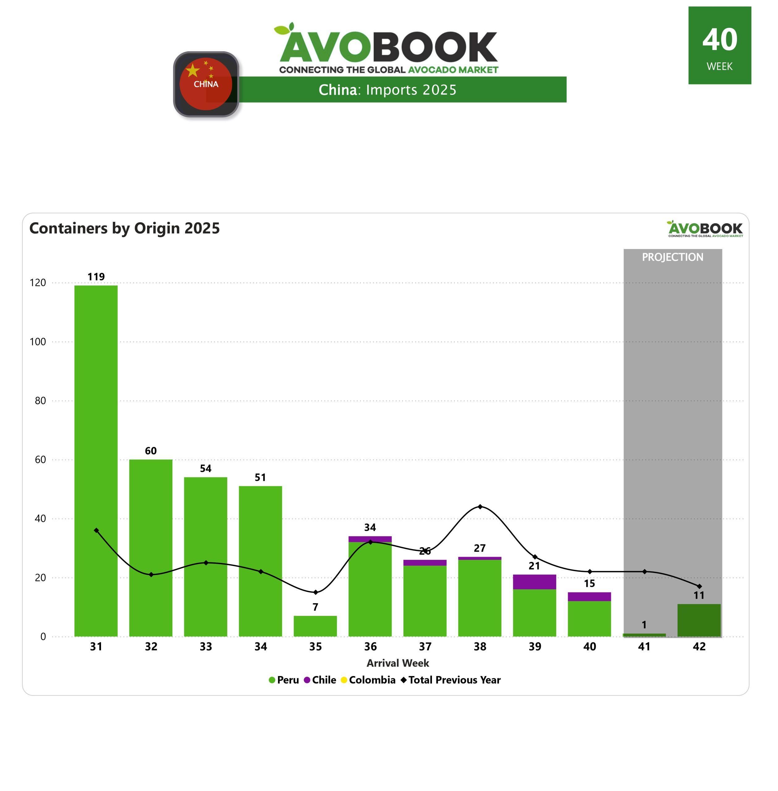 El mercado chino del aguacate cerró la semana con una baja considerable en su volumen de arribos, registrando solo 15 embarques, lo que representa una disminución del 29% respecto a la semana anterior. Del total, el 80% del volumen provino desde Perú, mientras que el resto llegó desde Chile, aunque ambos orígenes redujeron sus envíos en comparación con la semana previa.