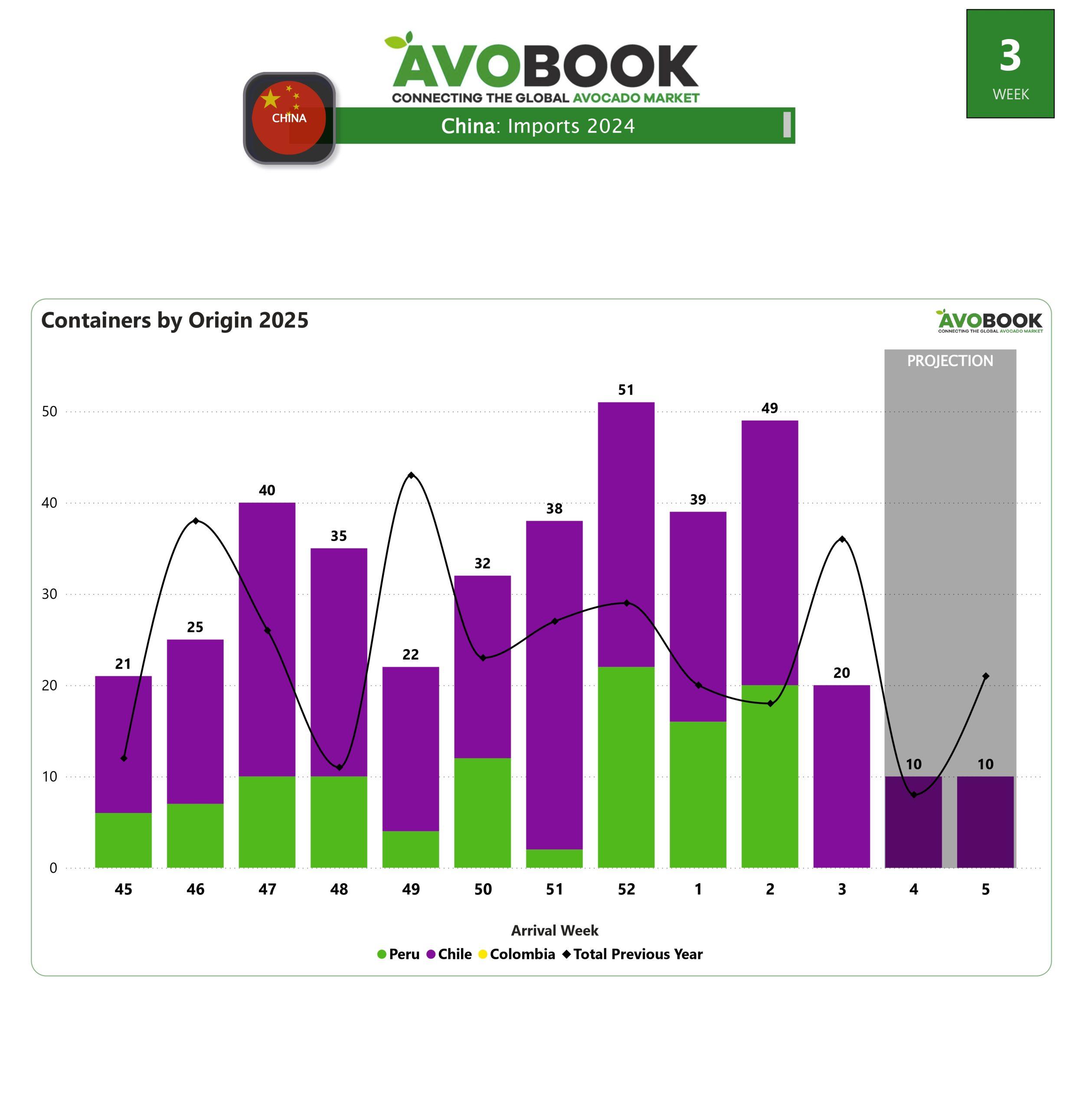El mercado chino continúa mostrando una tendencia a la baja en los envíos de aguacate desde Chile. Durante esta semana llegaron 21 contenedores, en comparación con los 29 de la semana anterior, marcando una disminución constante desde la semana 51 del año pasado. Este descenso semanal refleja una contracción en el volumen enviado por parte de Chile hacia este mercado.