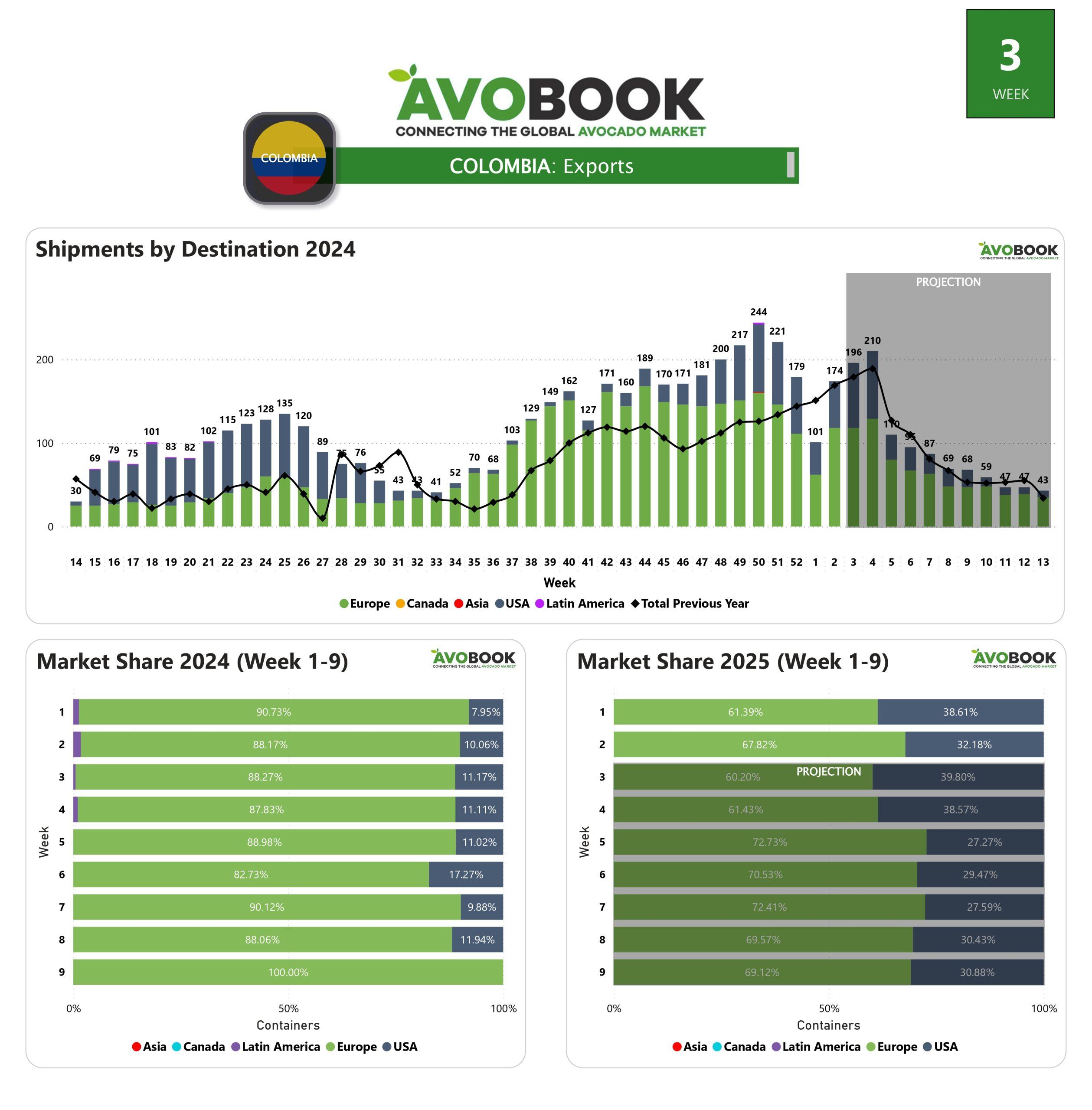 En Europa, Colombia alcanzó una participación del 29% del mercado durante la semana 2, mientras que en Estados Unidos fue del 4%. Las proyecciones para las próximas semanas son optimistas, anticipando un incremento en los volúmenes que podría superar los 200 contenedores, alcanzando un posible pico antes de que comience el descenso esperado con el cierre de la temporada.