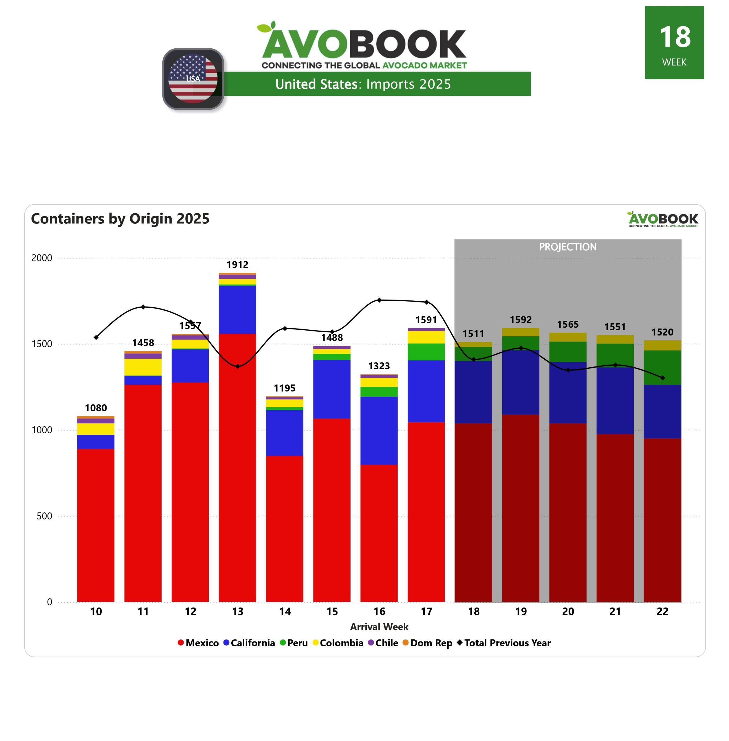 Al cierre de la semana 17, el mercado estadounidense muestra señales mixtas: optimismo por un repunte semanal, pero cautela por un rezago respecto al año pasado. Estados Unidos cerró la semana con la recepción de 1.591 embarques, lo que representa un incremento del 20% en comparación con la semana anterior, aunque todavía un 9% por debajo del volumen registrado en el mismo periodo del año pasado.