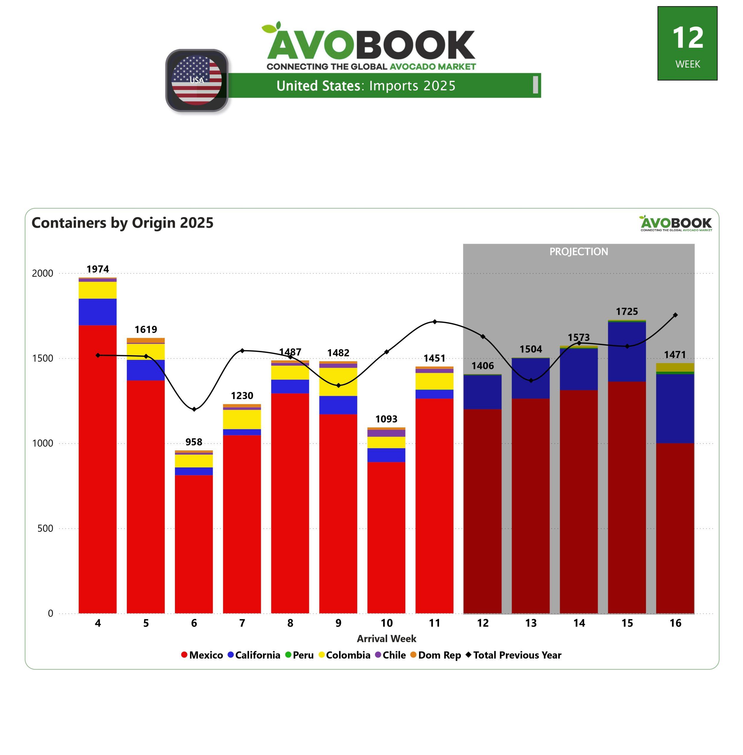 El mercado de Estados Unidos cerró la semana 11 con el ingreso de aproximadamente 1,451 embarques de aguacate, lo que representa un aumento del 33% respecto a la semana anterior. A pesar de este repunte, el volumen se mantiene un 15% por debajo de lo registrado en el mismo periodo del año pasado.