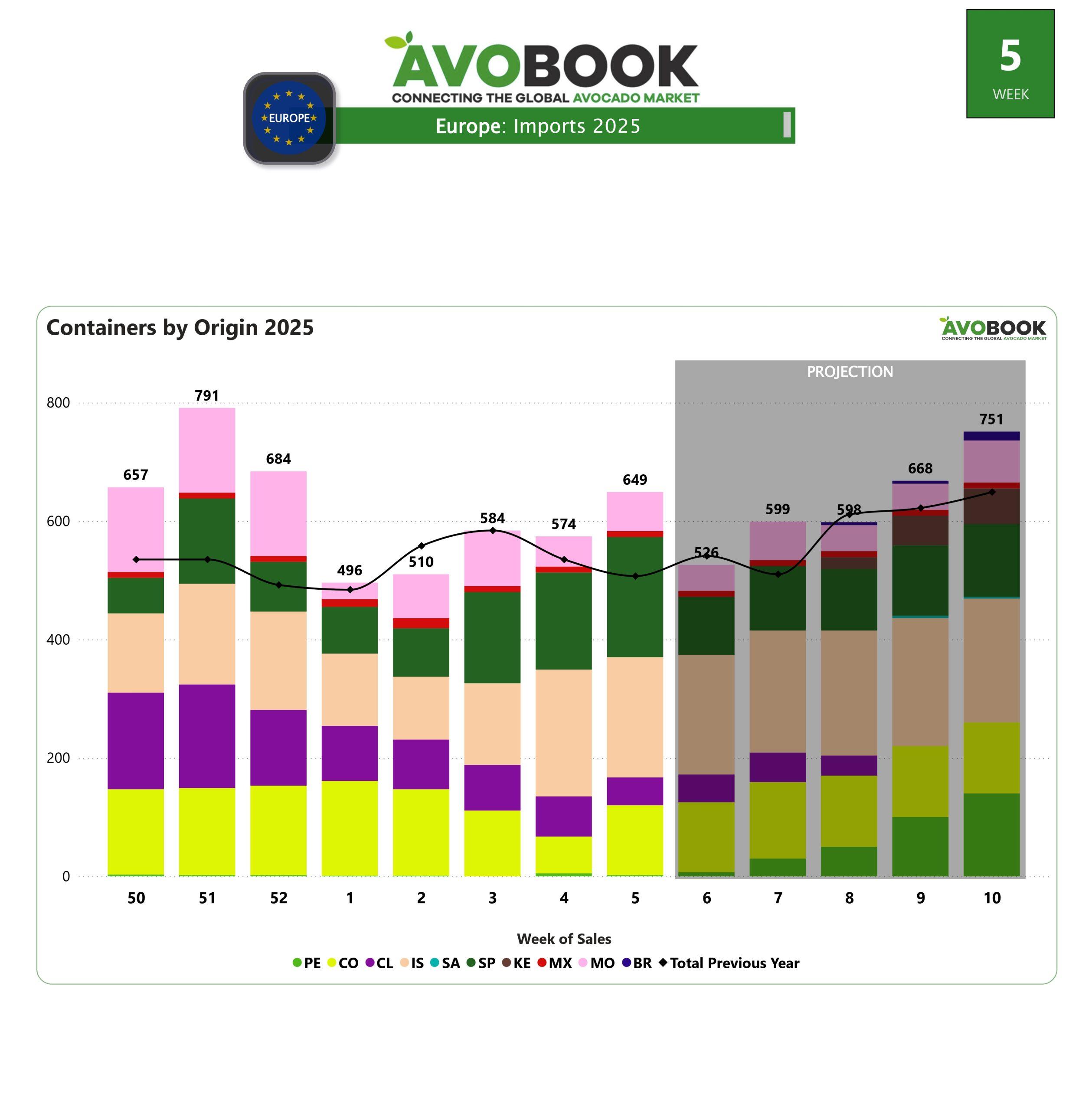 Al cierre de la semana 4, el mercado europeo de aguacates registra 649 contenedores, lo que representa un incremento del 13% respecto a la semana anterior y un 28% más en comparación con el mismo periodo del año pasado.