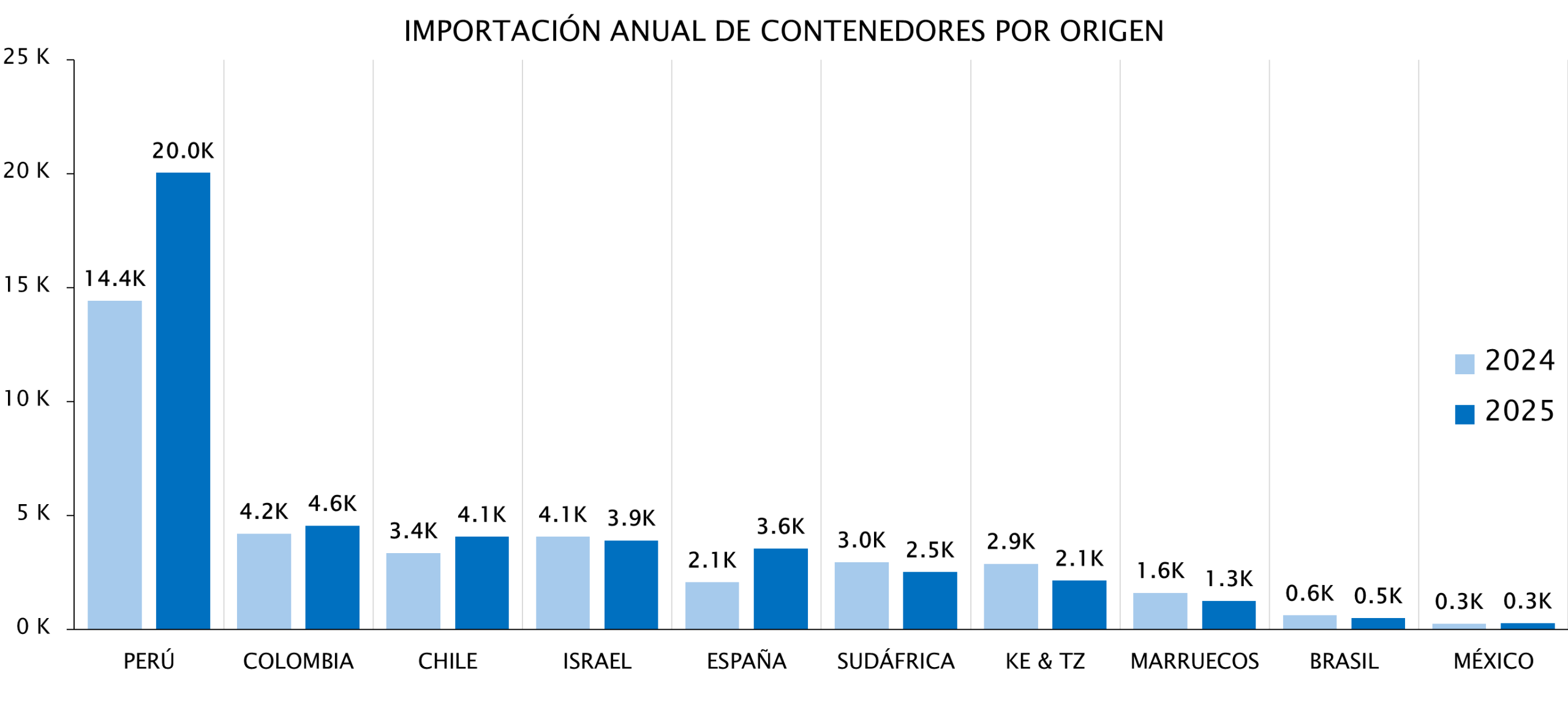 En contraste, otros orígenes redujeron su presencia respecto al año anterior. Israel, Sudáfrica, Marruecos, Brasil y la categoría conjunta de Kenia & Tanzania registraron descensos en sus envíos. La caída más pronunciada fue la de Kenia & Tanzania, con 743 contenedores menos que en 2024.