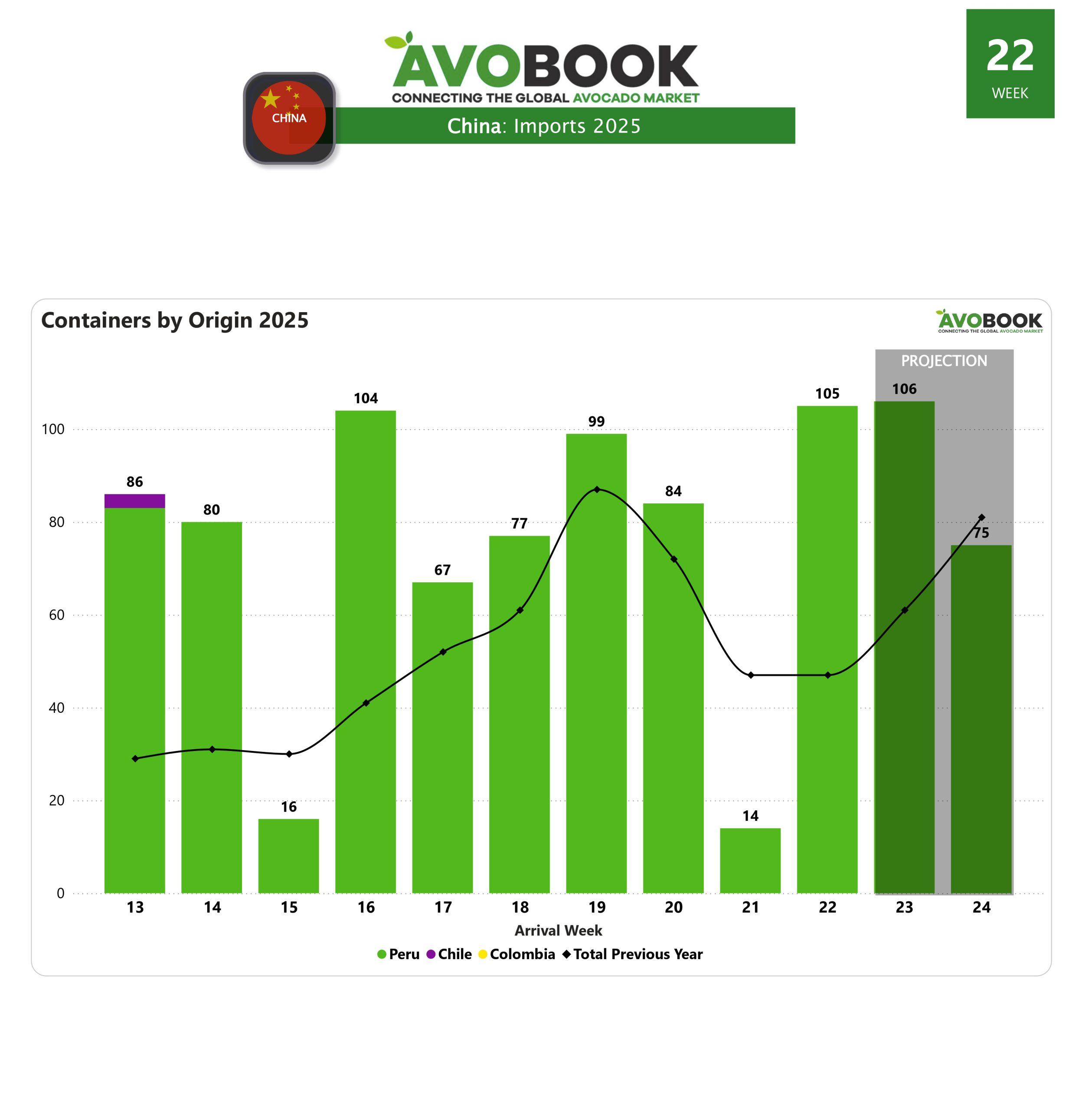 El mercado chino de aguacates cerró la semana 22 con un fuerte repunte en sus importaciones, alcanzando un total de 105 embarques. Esta cifra no solo supera ampliamente los niveles de la semana anterior —afectados por intermitencias logísticas en los puertos—, sino que también representa más del doble del volumen registrado en el mismo periodo del año pasado.