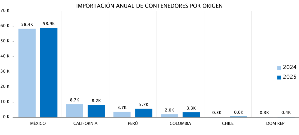 Colombia también marca un hito en 2025. Hasta la semana 50, los envíos ya alcanzaban los 3.277 contenedores, configurando un récord histórico para este origen en Estados Unidos. El crecimiento colombiano destaca tanto por su ritmo como por su consistencia, reflejando una estrategia de expansión sostenida y una mayor integración dentro del flujo comercial hacia Norteamérica.