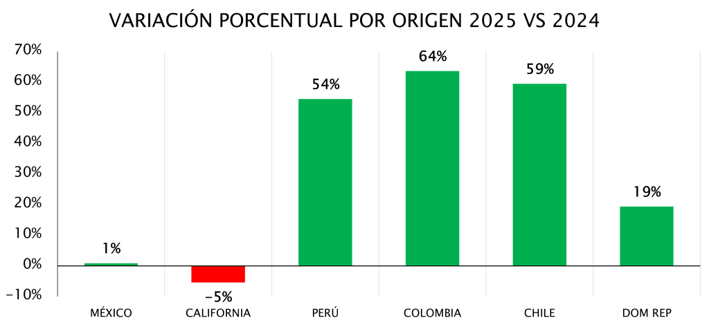El balance de 2025 confirma un cambio en la dinámica de abastecimiento del mercado estadounidense, donde el volumen total alcanza un nuevo máximo histórico y el protagonismo del crecimiento se desplaza hacia Sudamérica. Mientras México mantiene su liderazgo sin grandes variaciones y California conserva un rol estable, el fuerte avance de Perú y el récord de Colombia redefinen la composición del suministro en Estados Unidos.