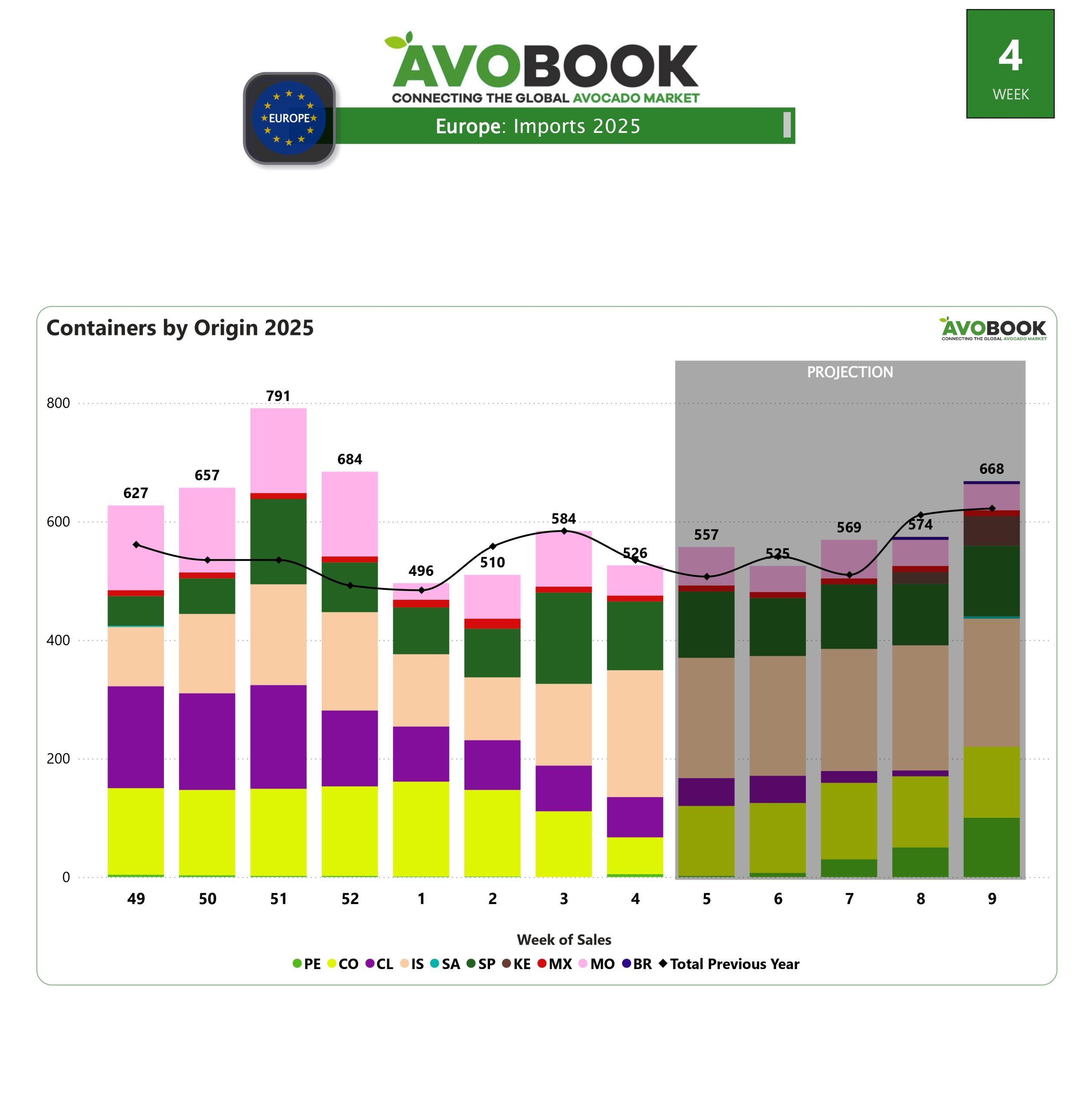 El mercado europeo cerró la cuarta semana del año con la recepción de 526 contenedores de aguacates, una cifra que representó una caída del 10% respecto a la semana anterior y un 2% por debajo del mismo periodo del año pasado. A pesar de este leve descenso, los volúmenes se mantienen en línea con los niveles típicos de esta etapa de la temporada, caracterizada por la ausencia de Perú como proveedor importante.