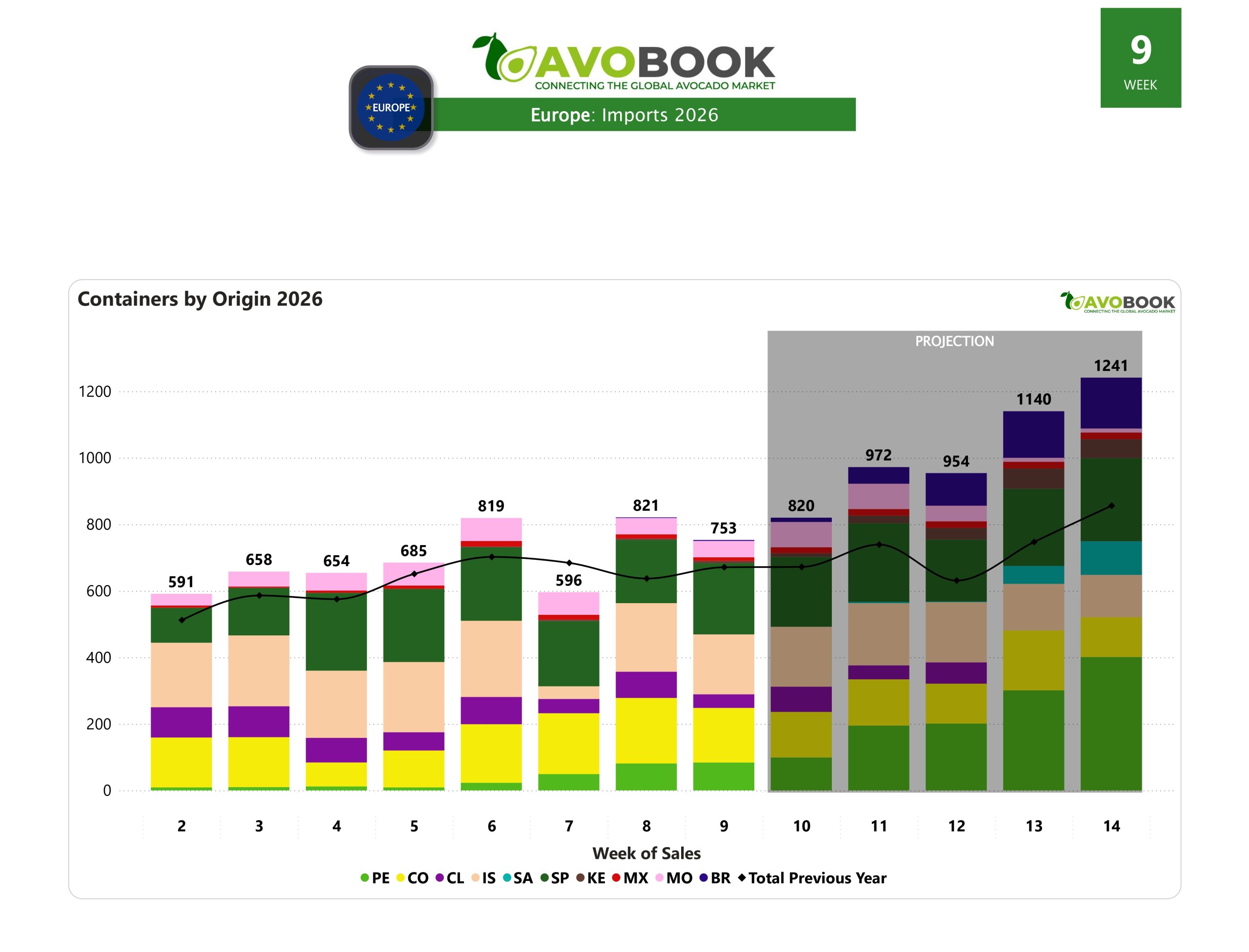 En la semana 9, Europa registró 753 embarques de aguacate arribando a sus principales puertos, lo que representa una caída de 8% respecto de la semana anterior. Sin embargo, en la comparación con la misma semana del año pasado, el volumen se ubica 12% por encima, manteniendo un nivel semanal superior al que históricamente se observa para este período.