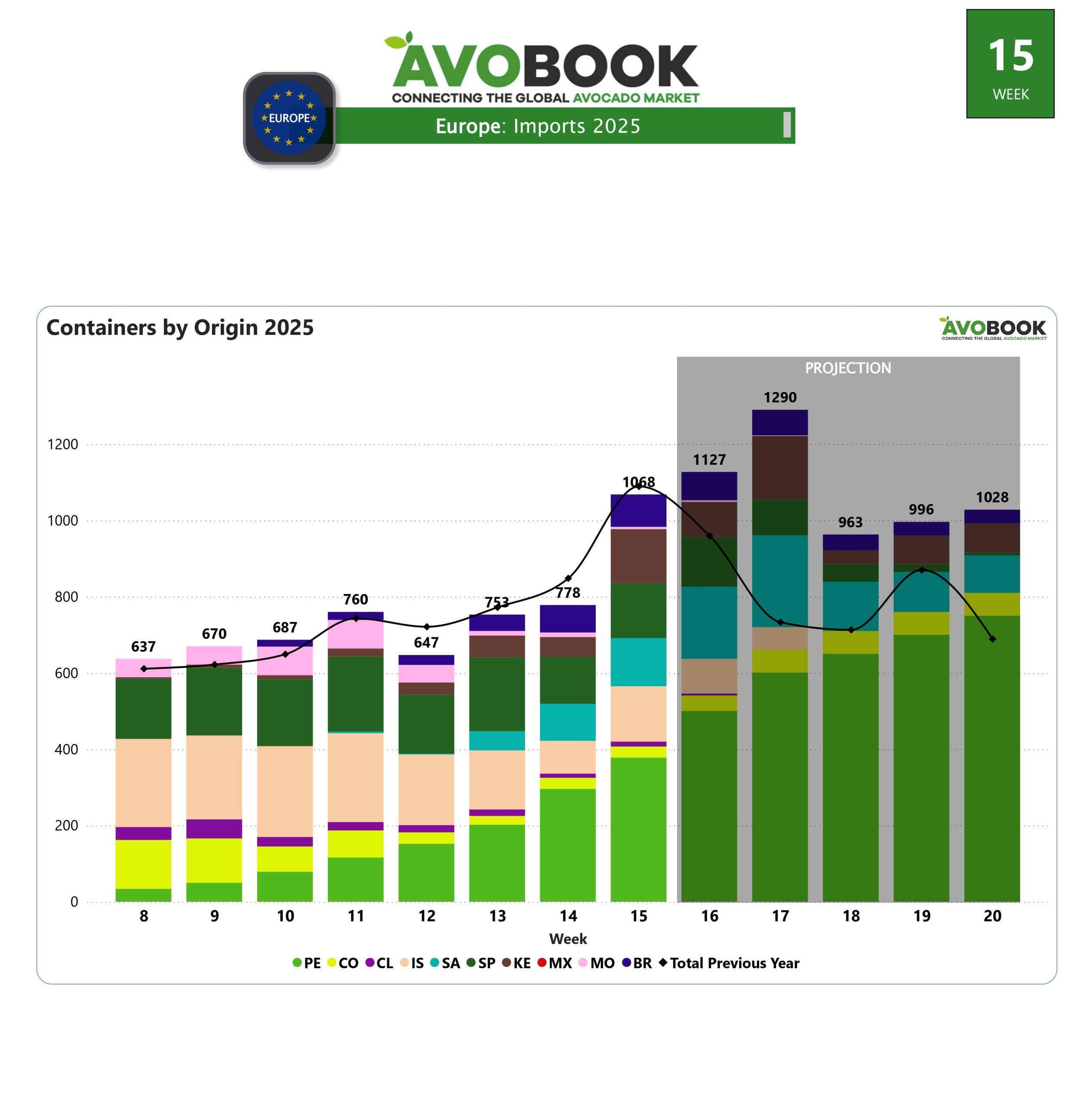 La semana 15 marcó un hito para el mercado europeo del aguacate con la llegada de 1.040 contenedores, un alza del 37% respecto a la semana anterior y, aunque aún se encuentra un 5% por debajo del volumen registrado en el mismo periodo del año pasado, se trata de la primera semana de 2025 en la que se supera la barrera de los mil contenedores. Curiosamente, fue también en la semana 15 del año pasado cuando se rompió esa marca, aunque con un volumen ligeramente superior al actual.