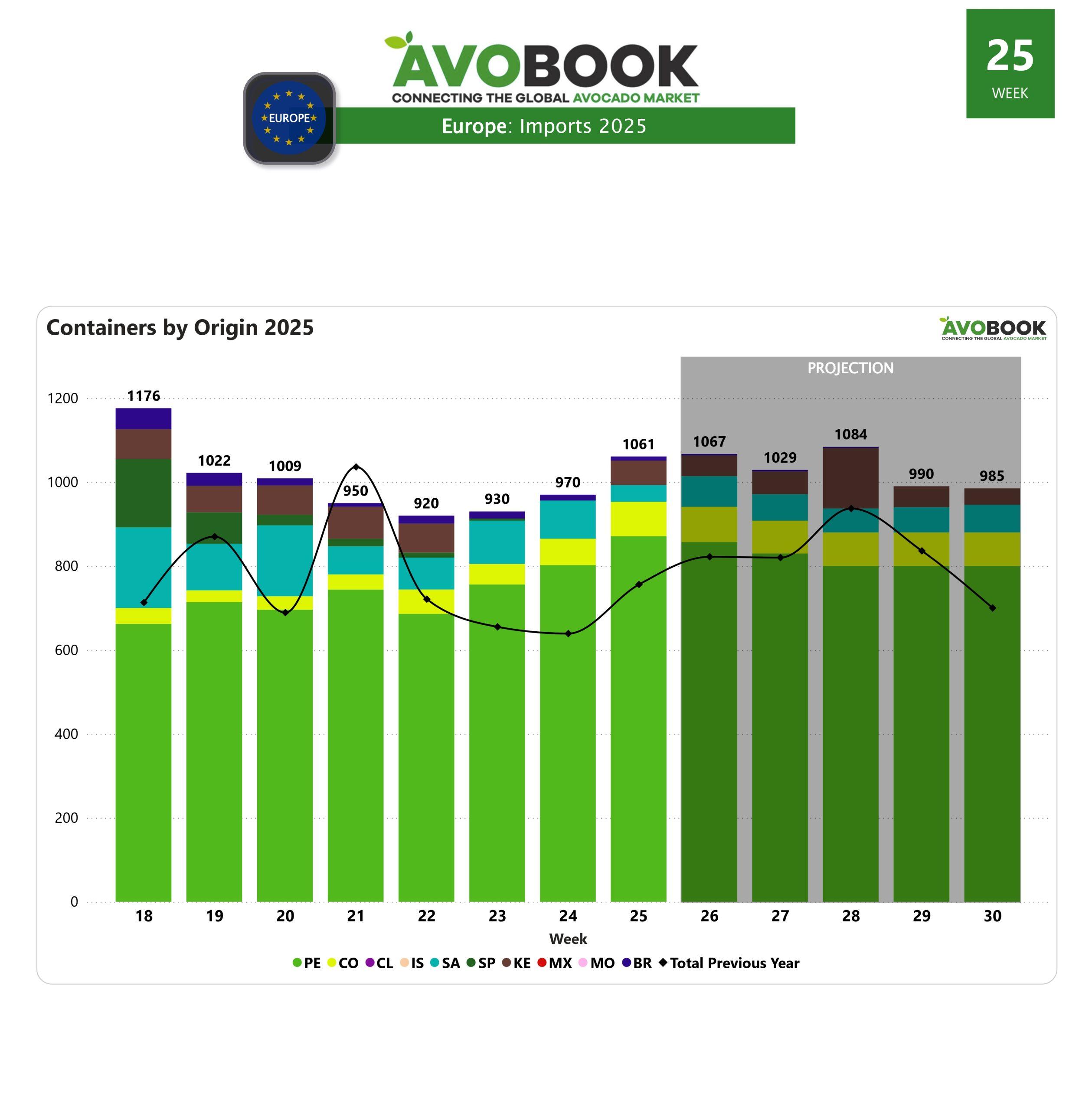 Durante la semana 25, el mercado europeo de aguacates recibió un total estimado de 1.055 contenedores, marcando un crecimiento del 9% en comparación con la semana anterior. Con esta cifra, Europa retoma el umbral de los mil contenedores semanales, una señal del repunte en el flujo de fruta hacia el continente.