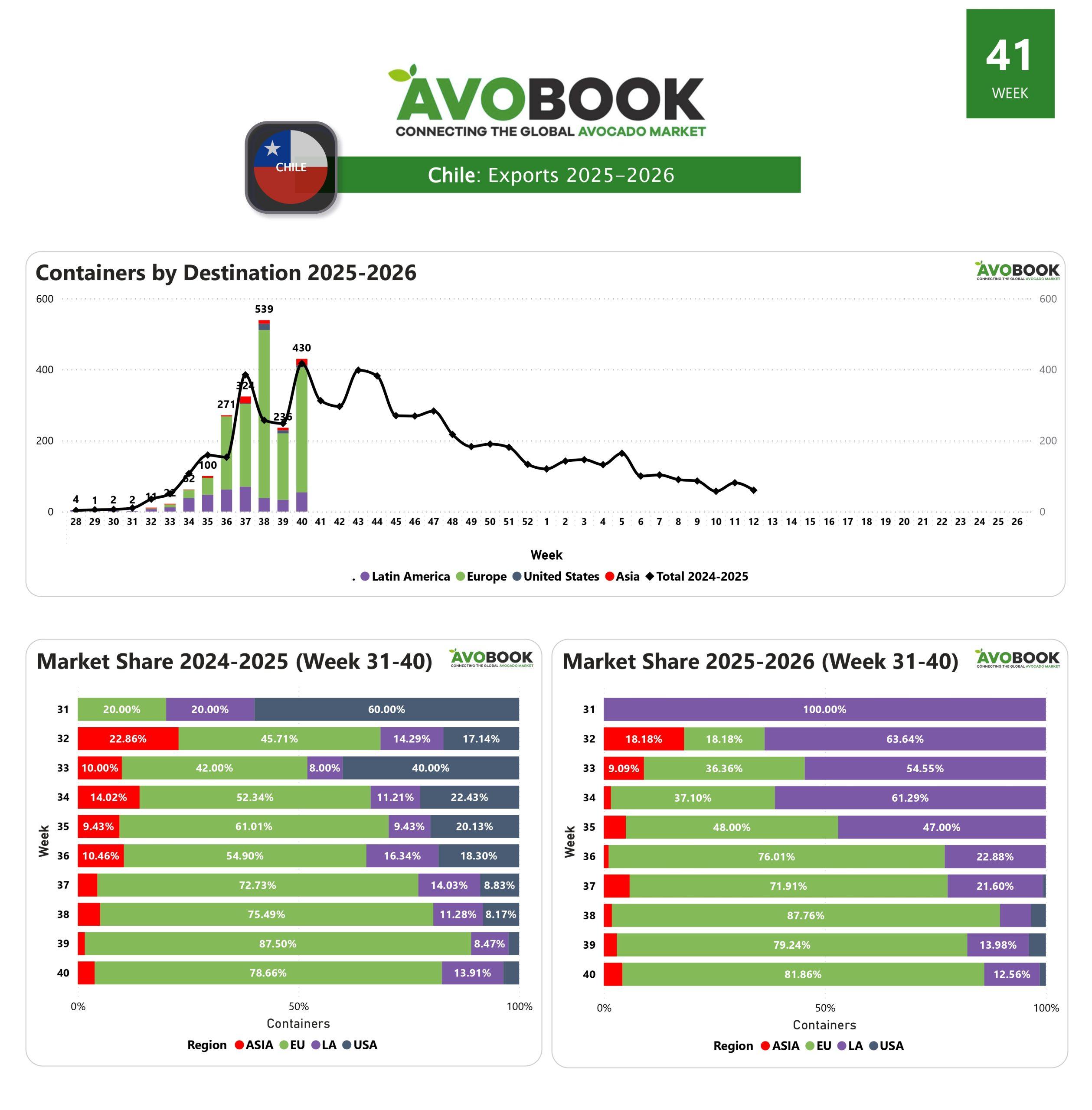 Durante el cierre de la semana 40, Chile registró la exportación de 430 contenedores de aguacate, lo que representa un aumento del 82,2% en comparación con la semana anterior y un 3,1% más respecto al mismo periodo del año pasado. Este repunte confirma el buen ritmo de la campaña 2025-2026, que acumula hasta la fecha un total de 1.841 contenedores enviados a los distintos destinos internacionales.