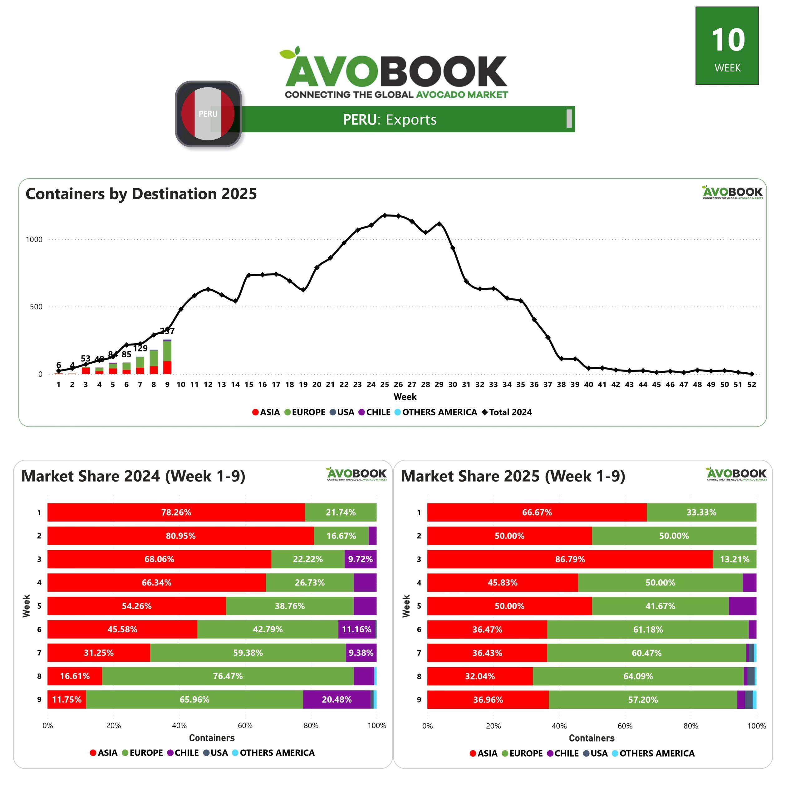 Al cierre de la semana 9, Perú exportó un total de 258 contenedores de aguacate, lo que representa un aumento del 43 % en comparación con la semana anterior. Sin embargo, el volumen aún se mantiene un 21 % por debajo de los niveles registrados en la misma semana de 2024.