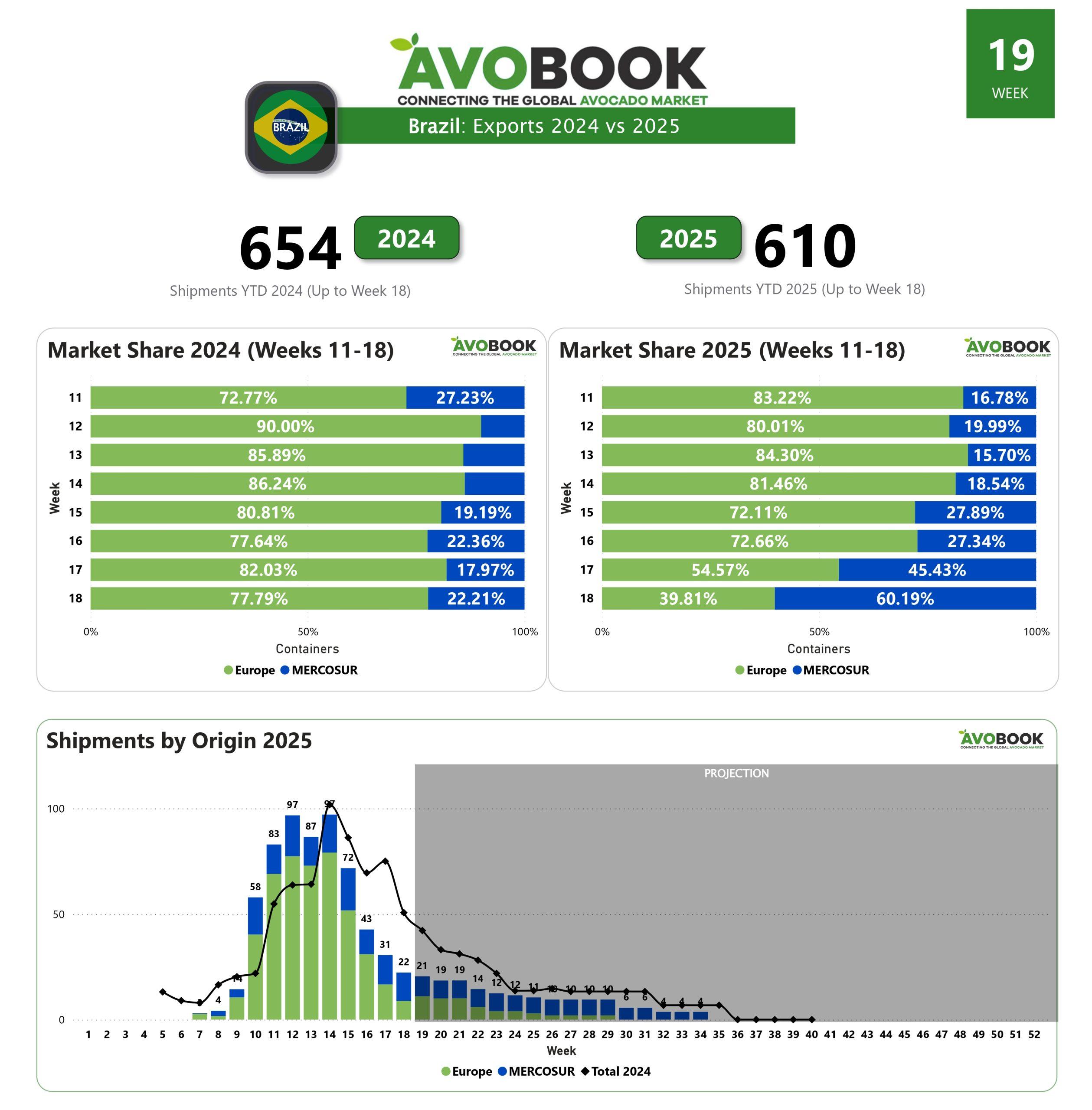 Las exportaciones de aguacate desde Brasil continúan su tendencia descendente y se alejan cada vez más de los volúmenes observados durante sus semanas más activas. Al cierre de la semana 18, el país sudamericano envió apenas 22 contenedores, una cifra que contrasta fuertemente con los casi 100 contenedores semanales que registró en los momentos de mayor actividad, como ocurrió entre las semanas 13 y 14.