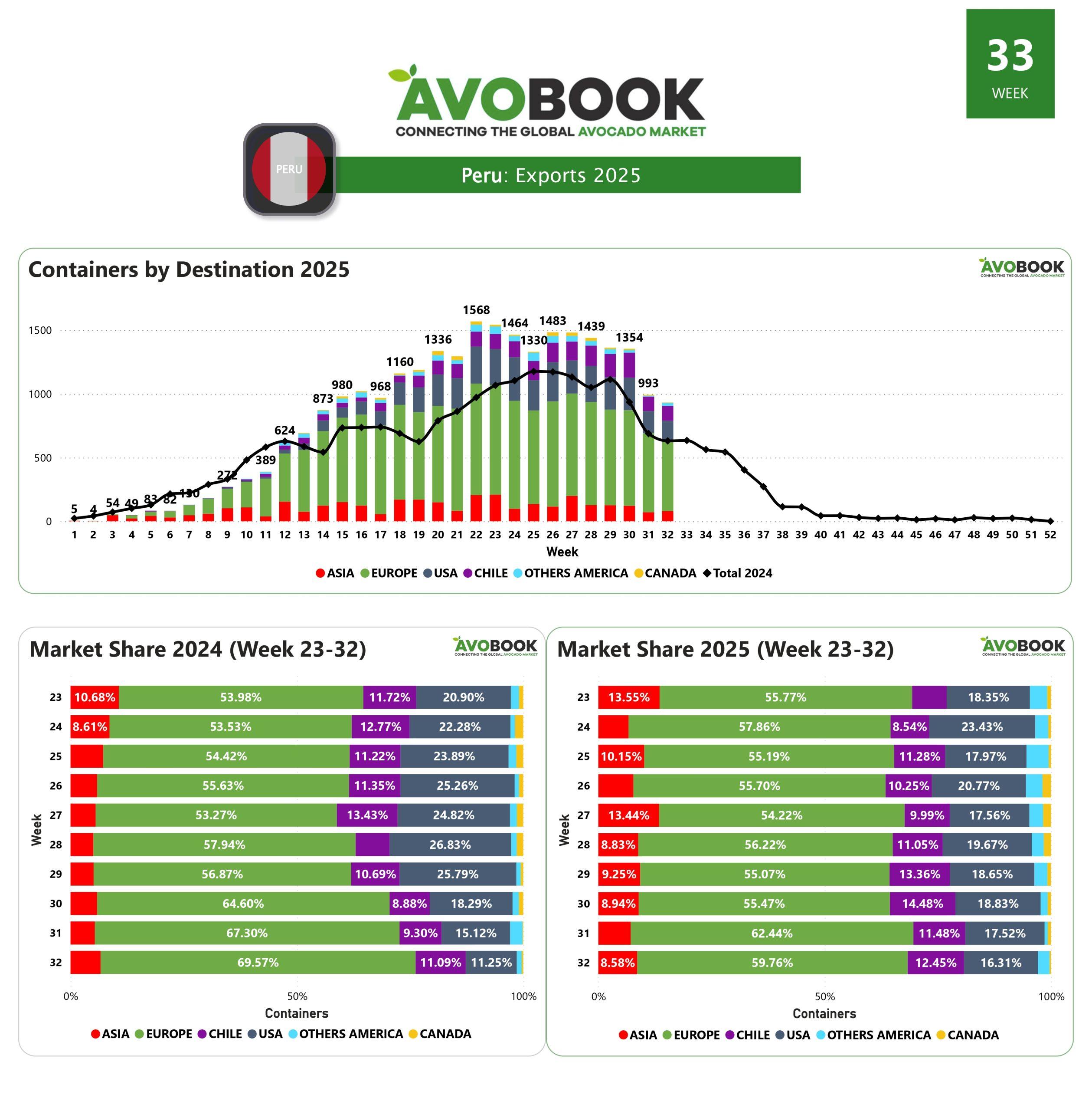 Particularmente en Europa, la presencia de Perú ha sido determinante. La participación de la fruta peruana en ese mercado no ha bajado del 80% en las últimas semanas, pese a la disminución progresiva de envíos desde el país andino. Esta caída en los volúmenes comenzó a notarse desde la semana 27 y se ha repetido de manera sostenida semana tras semana.