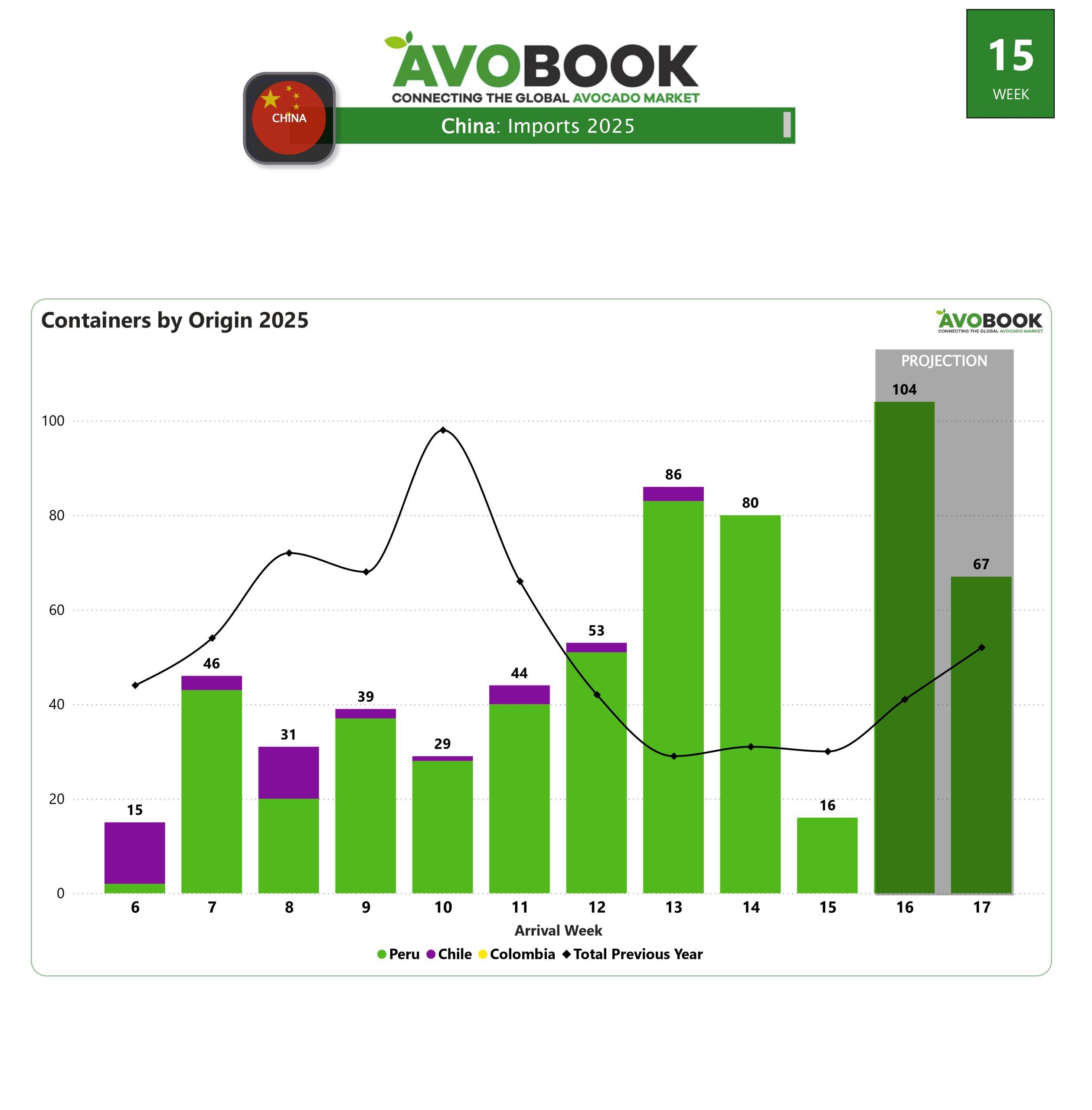 La semana 15 cerró con una fuerte caída en los embarques de aguacate hacia China, registrándose solo 16 contenedores, lo que representa una disminución cercana al 80% en comparación con la semana anterior. Sin embargo, esta baja no necesariamente debe interpretarse como un signo de alerta.