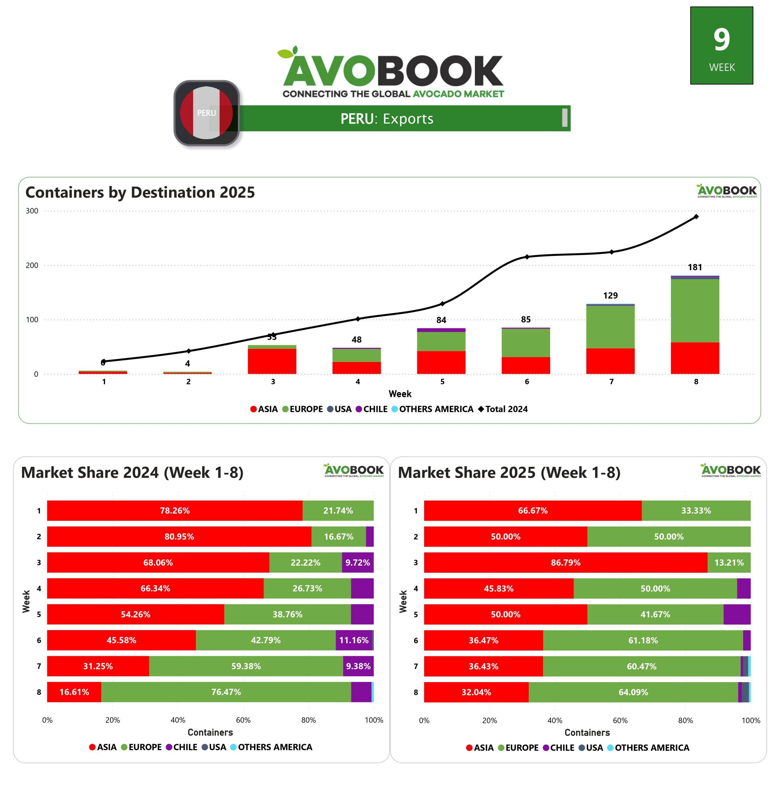 Perú mostró un notable crecimiento en este cierre de la semana 8, con un total de 181 contenedores enviados. Esta cifra representa un incremento del 40% en comparación con la semana anterior, reflejando una tendencia al alza en la producción y comercialización del país.