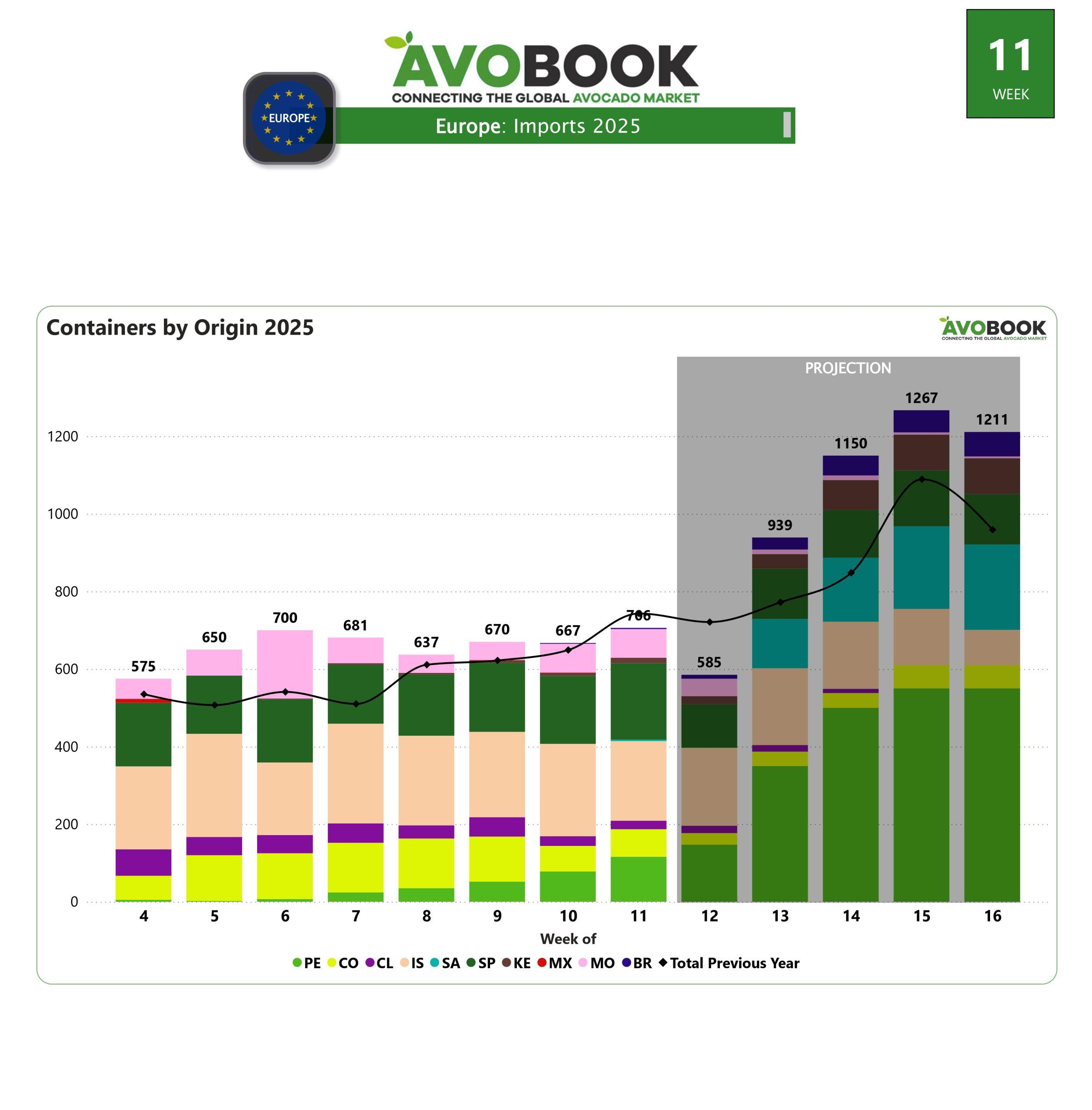 El mercado europeo de aguacates cerró la semana con el ingreso de 706 embarques, lo que representa un incremento del 6% respecto a la semana anterior, aunque sigue un 5% por debajo del volumen registrado en el mismo periodo del año pasado.