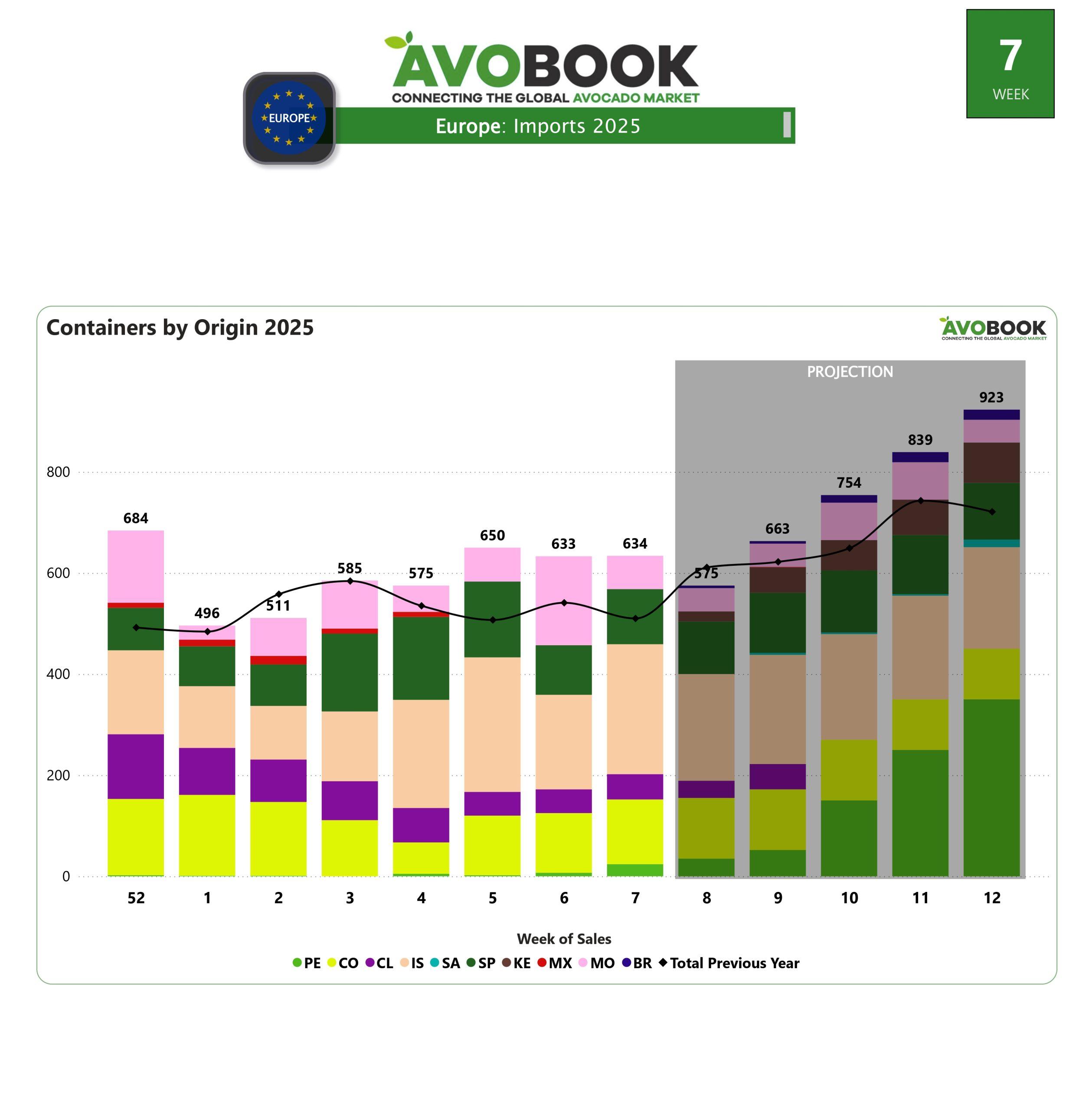 El mercado europeo de aguacates cerró la semana 7 con un total de 624 contenedores importados, una cifra similar a la semana anterior, con una ligera disminución del 1%.