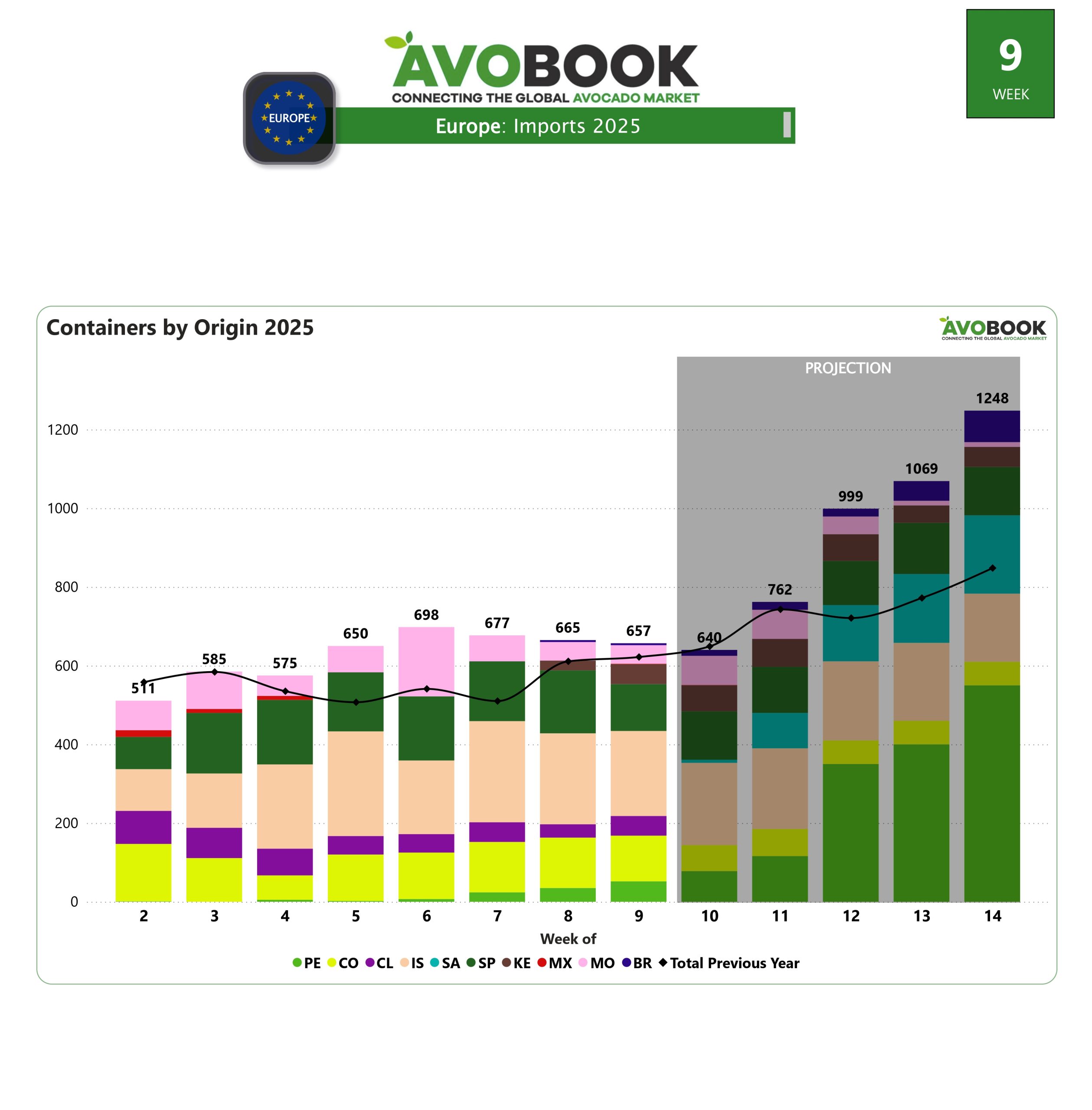 El mercado europeo cerró la novena semana del año con la recepción de 657 contenedores de aguacate, manteniendo un nivel de volumen prácticamente estable desde la semana 6. La leve reducción del 1% con respecto a la semana anterior no representa un cambio significativo en la dinámica del mercado, que sigue mostrando un equilibrio en la oferta.