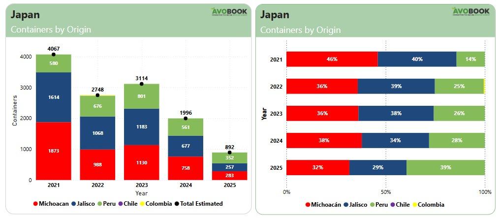 Según datos de Avobook, las exportaciones totales de aguacate hacia Japón han disminuido de forma significativa entre 2021 y 2025. En 2021 se enviaron un total de 4,067 contenedores, cifra que cayó a 2,748 en 2022, luego a 3,114 en 2023, y descendió a 1,996 en 2024. En 2025, el volumen actual, hasta el mes de mayo, van 892 contenedores.