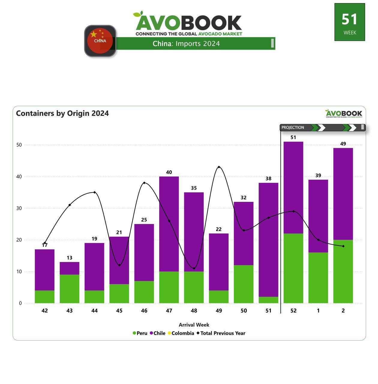 El mercado chino mostró un leve incremento en los envíos de aguacate durante la semana 51, registrando un crecimiento del 19% respecto a la semana anterior. Aunque esto se traduce en solo 38 cargas, la variabilidad en los volúmenes y los cambios en los principales orígenes de exportación dificultan predecir tendencias claras en esta región.