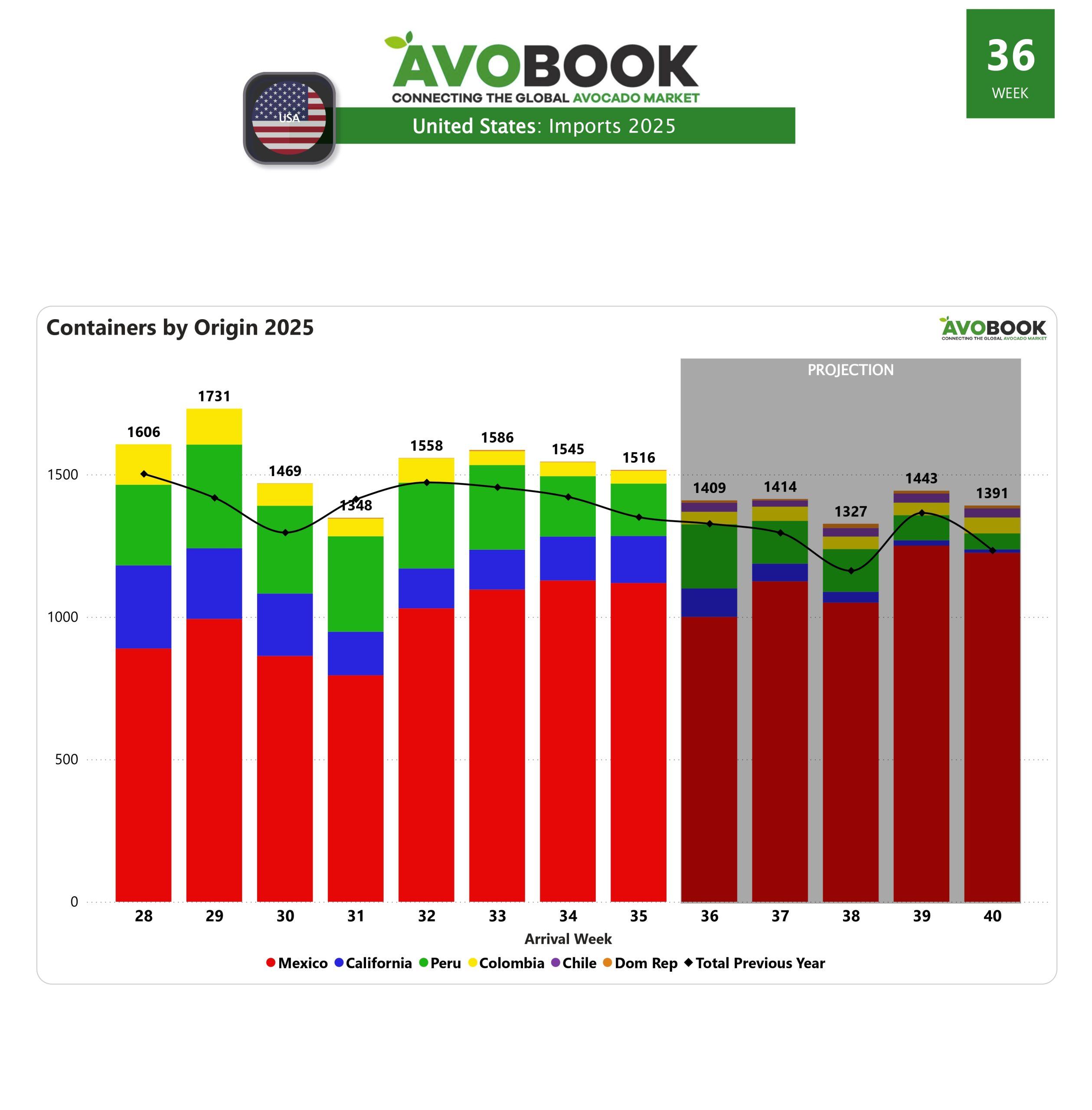 El mercado del aguacate en Estados Unidos cerró la semana 35 con un total de 1,516 llegadas entre camiones y contenedores. La cifra representa una leve disminución de 2% frente a la semana anterior y una caída más marcada de 12% en comparación con el mismo periodo del año pasado.