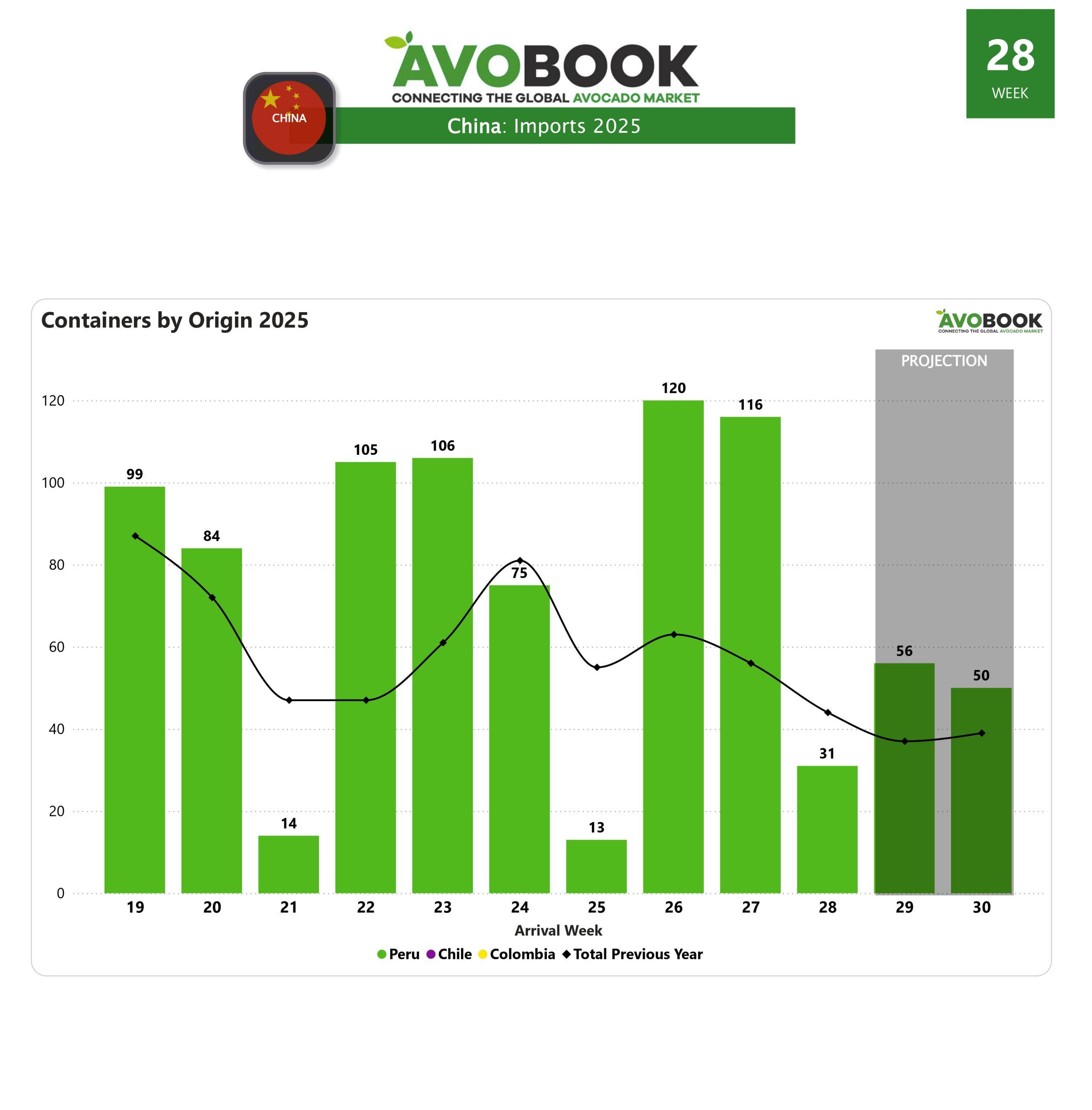 El mercado chino de aguacates continúa mostrando un comportamiento errático y poco predecible. Durante la semana 28, China recibió apenas 31 envíos provenientes de Perú, lo que representa una caída del 73% en comparación con la semana anterior. Esta fuerte disminución, sin embargo, no sorprende a los actores del sector, ya que responde a una dinámica de intermitencia que se ha repetido en semanas recientes.