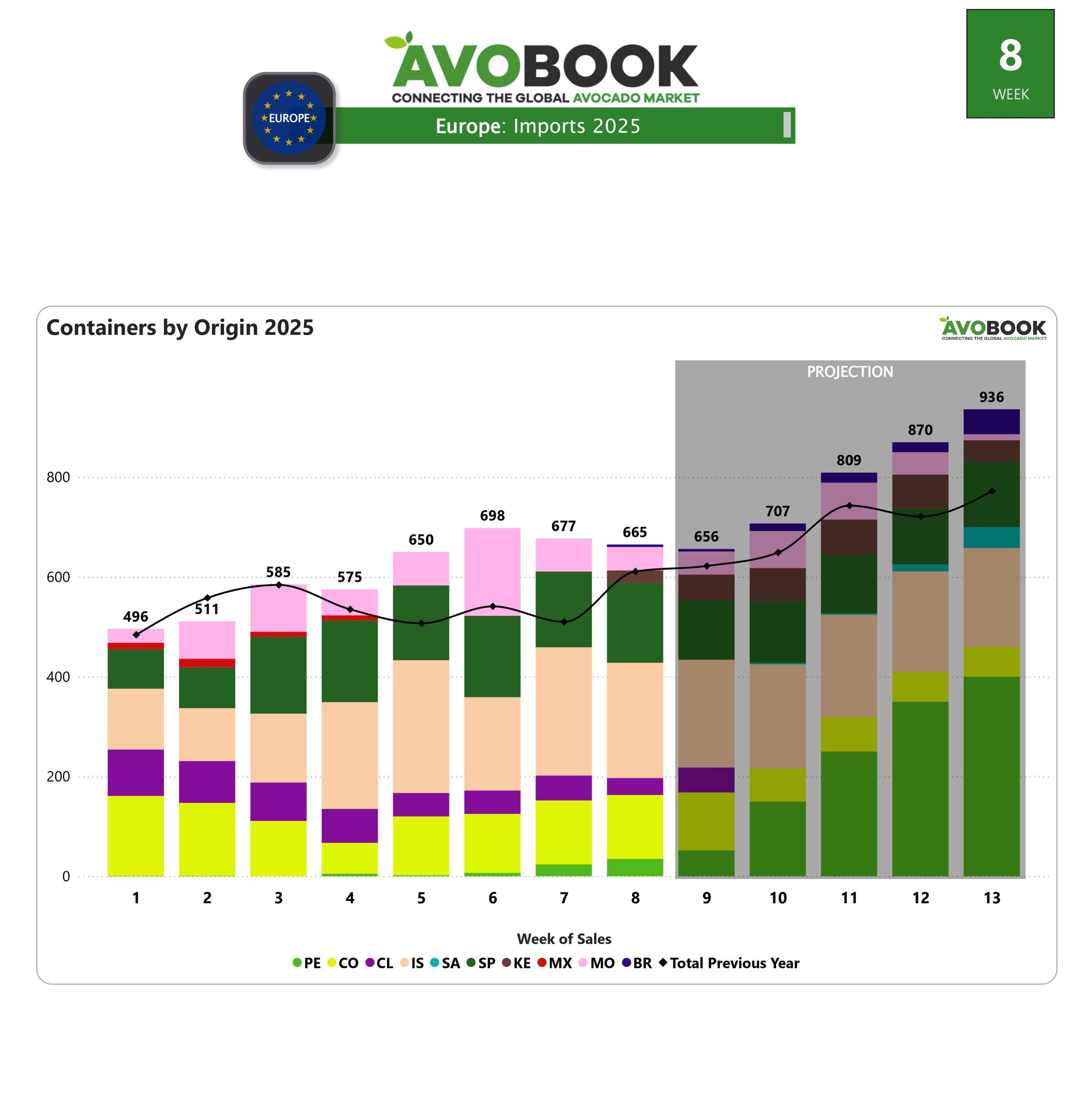 El mercado del aguacate en Europa mantiene una tendencia estable en términos de volumen durante las últimas cuatro semanas. En la semana 8, se registraron 665 embarques, apenas un 2% por debajo de la semana anterior, pero un 9% por encima de los niveles del mismo período en 2024.