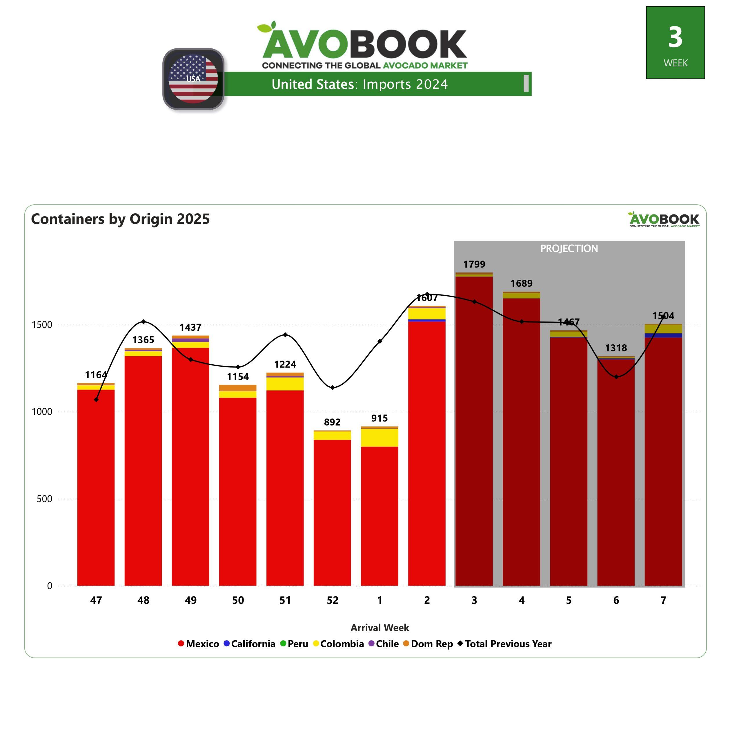 Al cierre de la semana 2, Estados Unidos reportó la recepción de 1,607 embarques de aguacate, marcando un incremento del 76% respecto a la semana anterior. Este crecimiento refleja una importante recuperación por parte de México, que volvió a consolidarse como el principal proveedor, con un 94% de participación en el mercado.
