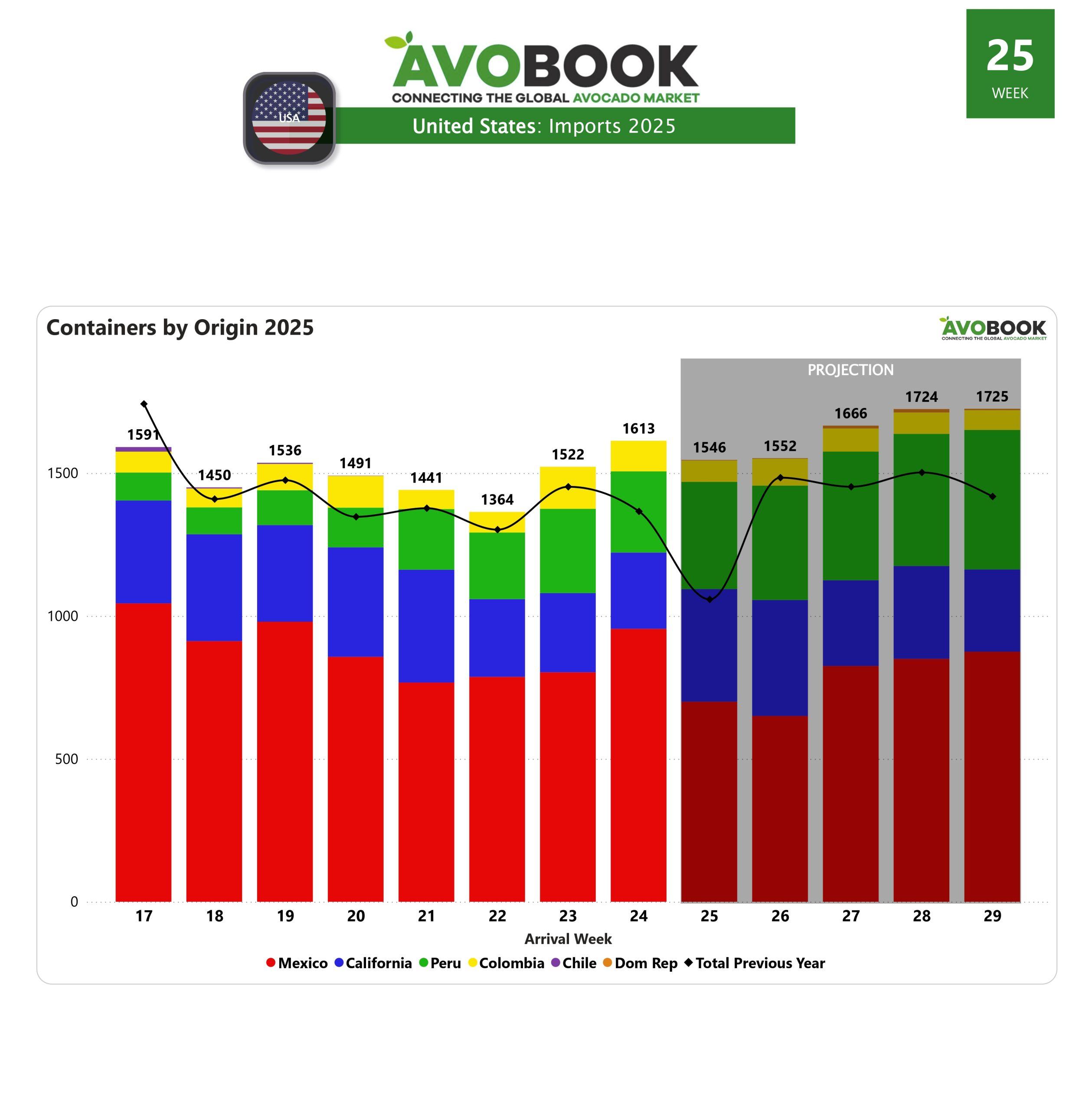 En términos de distribución por origen, México lidera ampliamente, seguido por Perú con un 18%, California con un 17% y Colombia con el 6% restante. Mientras que los volúmenes de Perú y California se mantuvieron relativamente estables con ligeros descensos del 3% al 4%, Colombia enfrentó una caída significativa del 27% en comparación con la semana anterior. En contraste, México experimentó un repunte notable del 19%, consolidando su dominio en el mercado.