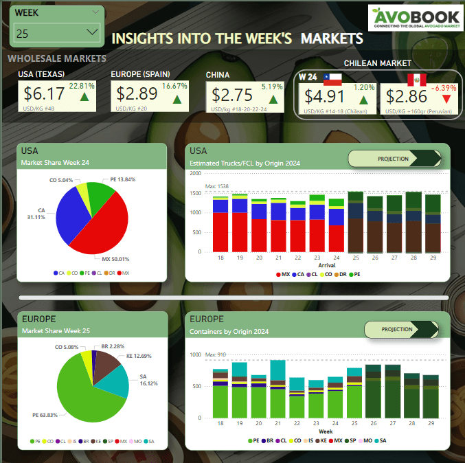 Como era de esperar y dada la contingencia de la suspensión de los envíos de Michoacán a Estados Unidos, el Reporte Avobook W 25 no registra despachos a su mercado vecino. Al revisar el volumen de ese origen, se aprecia un descenso desde los 33 millones de libras a los 27 millones, dejándolo con un 50% de participación de mercado.