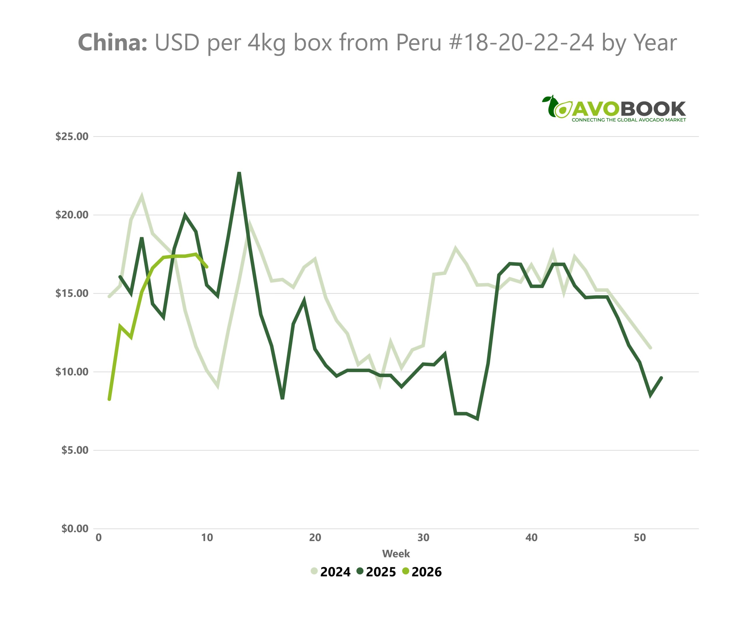 La semana 9 ya dejó ver señales de corrección. Los precios mostraron un rango amplio —entre RMB 210 y 270 para cajas de 10 kg y entre RMB 90 y 140 para formatos de 4 kg— reflejando un mercado menos ordenado y con diferencias más marcadas según calidad y rotación de inventario.