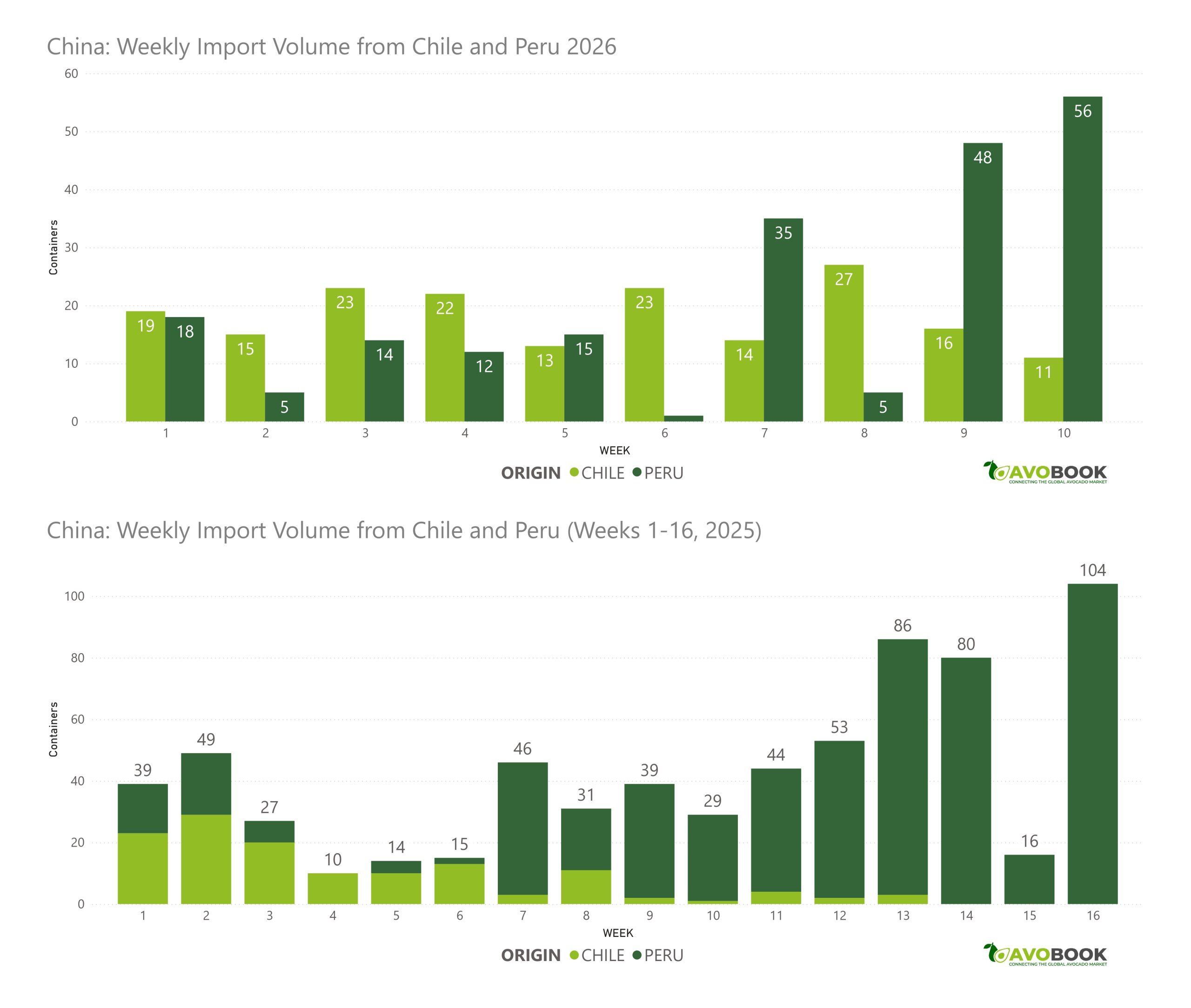 De acuerdo con el equipo de Datos de Avobook, el cambio ya se observa en los volúmenes recientes que llegan al mercado asiático. Chile ha comenzado a salir del circuito de abastecimiento: pasó de 27 contenedores enviados en la semana 8 a 16 en la semana 9 y apenas 11 en la semana 10.