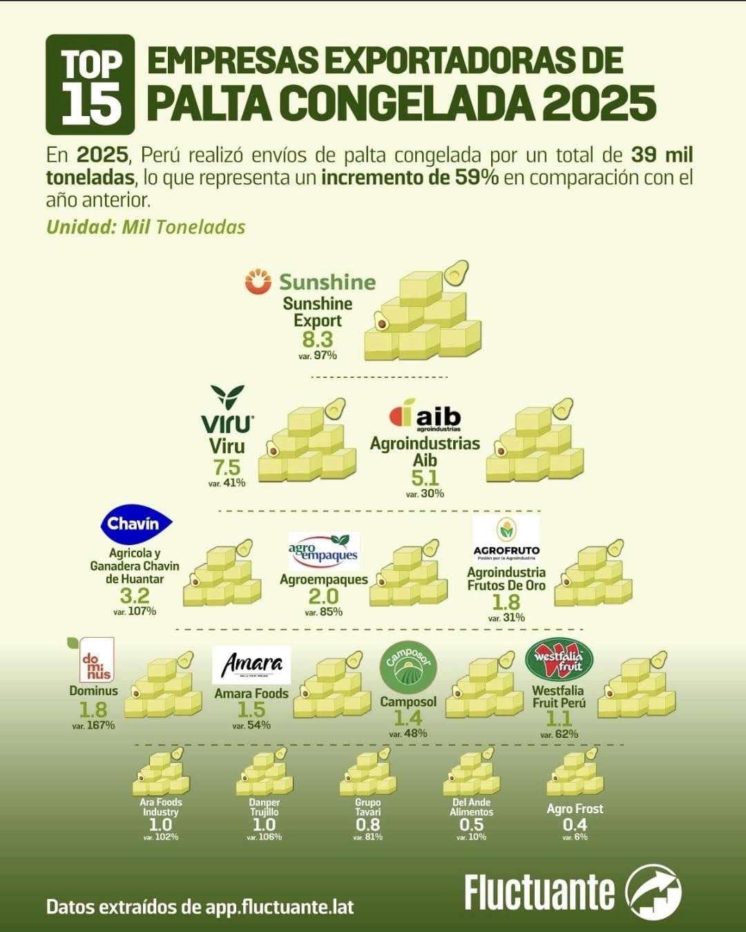 El liderazgo empresarial del sector en 2025 lo encabeza Sunshine Sunshine Export, con 8,3 mil toneladas enviadas al exterior y una variación anual de 97%, posicionándose como la principal exportadora del país en esta categoría. En segundo lugar figura Viru, con 7,5 mil toneladas y un crecimiento de 41%, mientras que Agroindustrias AIB ocupa el tercer puesto con 5,1 mil toneladas y un alza de 30%.