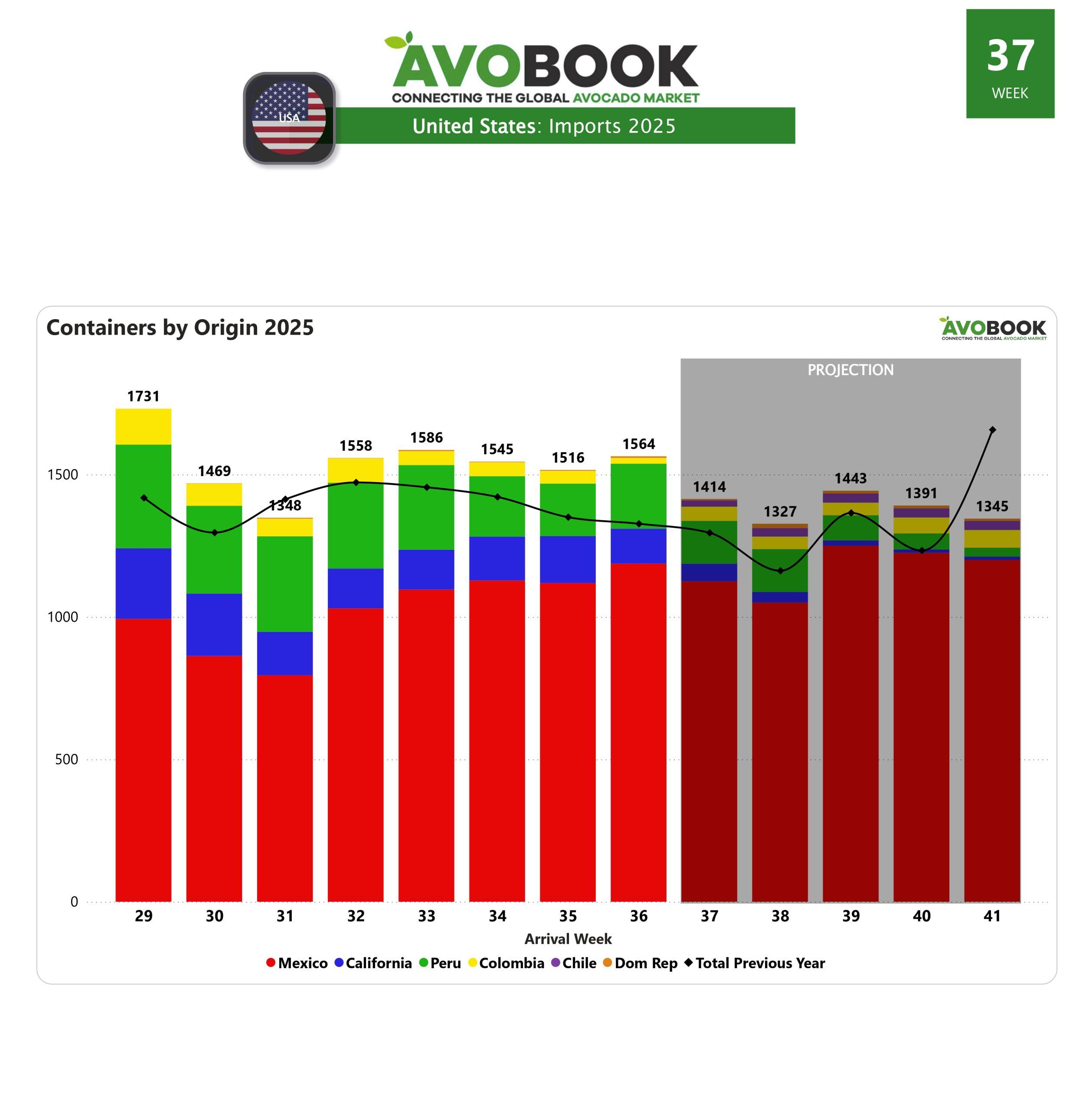 Al cierre de la semana 36, el mercado estadounidense cerró con un total de 1563 llegadas desde contenedores y camiones. Esta cifra representa un incremento del 3% respecto a la semana anterior y un 18% por encima del volumen registrado en el mismo periodo del año pasado.