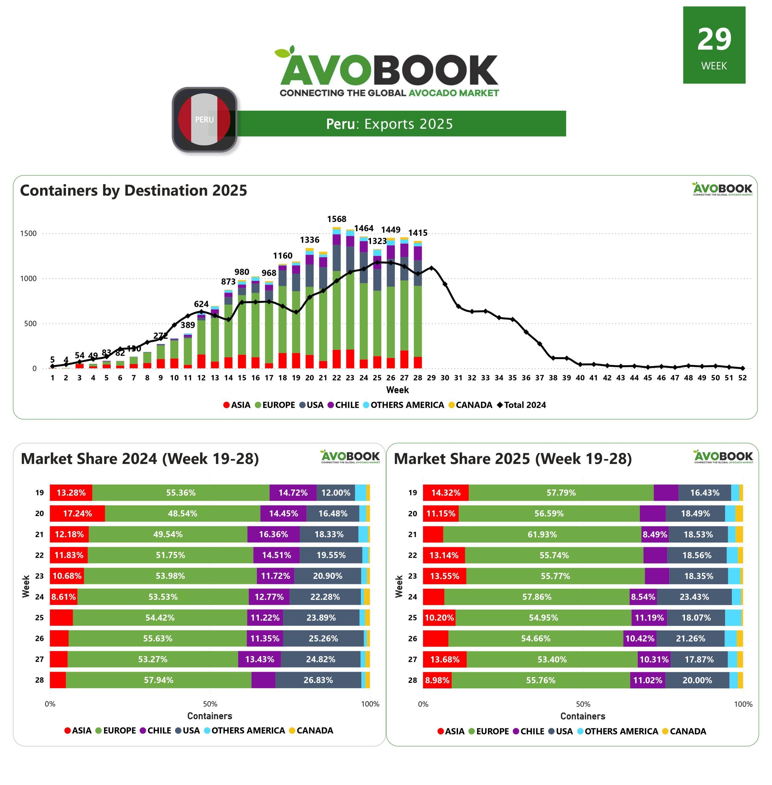 Durante el cierre de la semana 28, Perú registró un total de 1.415 contenedores de aguacate exportados, lo que representa una disminución del 3% respecto a la semana anterior. No obstante, el volumen sigue siendo significativamente superior al del año pasado, con un incremento del 35% en comparación con el mismo período de 2024.