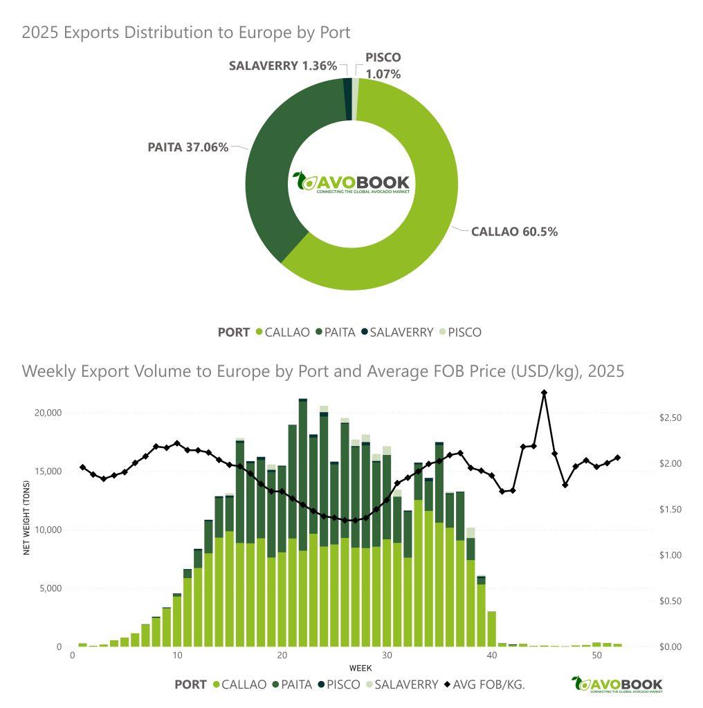 Desde el punto de vista logístico, el 60% de la fruta enviada a Europa salió por el puerto del Callao, mientras que Paita concentró un 37%. Salaverry y Pisco participaron con volúmenes marginales, cercanos al 1% cada uno. Esta distribución confirma la centralidad del Callao como principal puerta de salida del aguacate peruano hacia el mercado europeo.