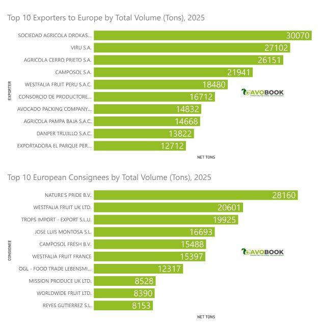 Del lado de la demanda, el principal consignatario europeo importó aproximadamente 28.000 toneladas de aguacate peruano, superando por más de 8.000 toneladas al segundo mayor comprador. Esta diferencia evidencia una marcada concentración también en la recepción y distribución de la fruta en el continente.