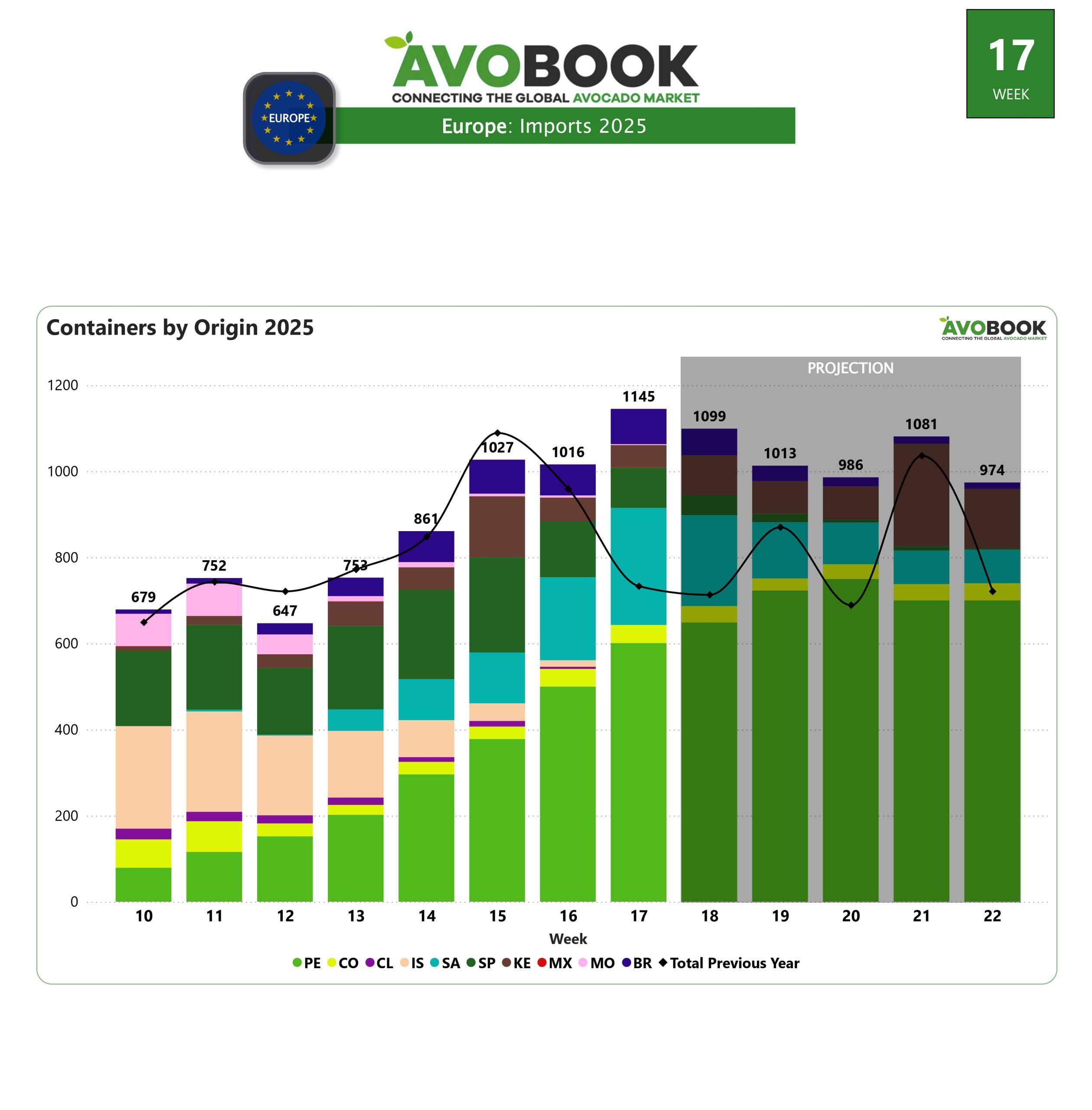 El mercado europeo del aguacate cerró la semana con la llegada de aproximadamente 1.145 contenedores, marcando un aumento del 13% respecto a la semana anterior y un 56% por encima de los registros del mismo período en 2024. El volumen continúa superando cifras históricas y confirma que el mercado alcanza su punto máximo de abastecimiento en estas fechas.