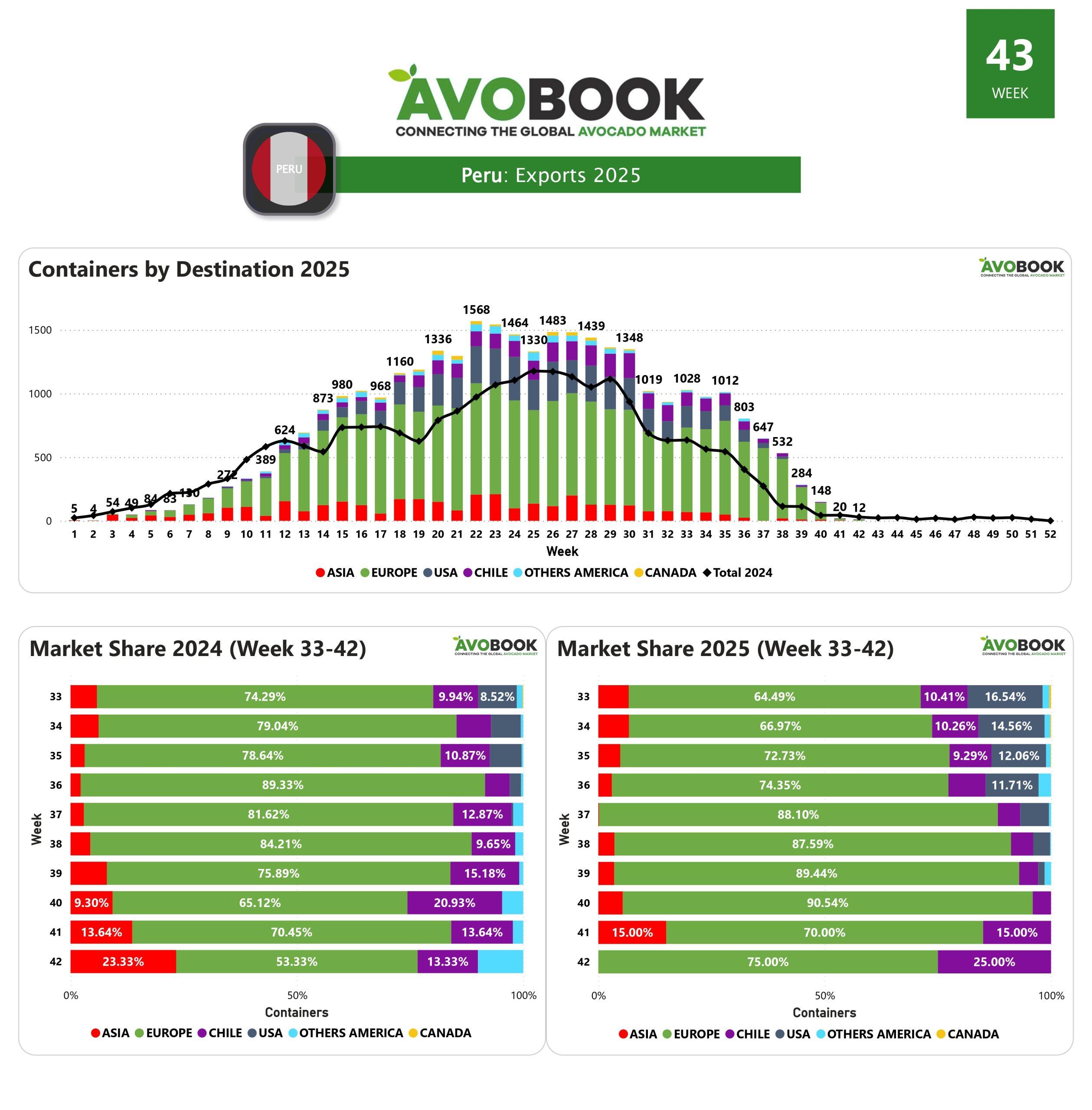 Esta tendencia ya se refleja en la estructura de participación del mercado europeo. En la semana 43, Perú representó el 21% del total de importaciones de aguacate en el continente, aunque los analistas prevén que esa cuota descenderá pronto al 10% o menos, conforme los volúmenes chilenos e israelíes ganen protagonismo y se consolide la rotación de orígenes de fin de año.