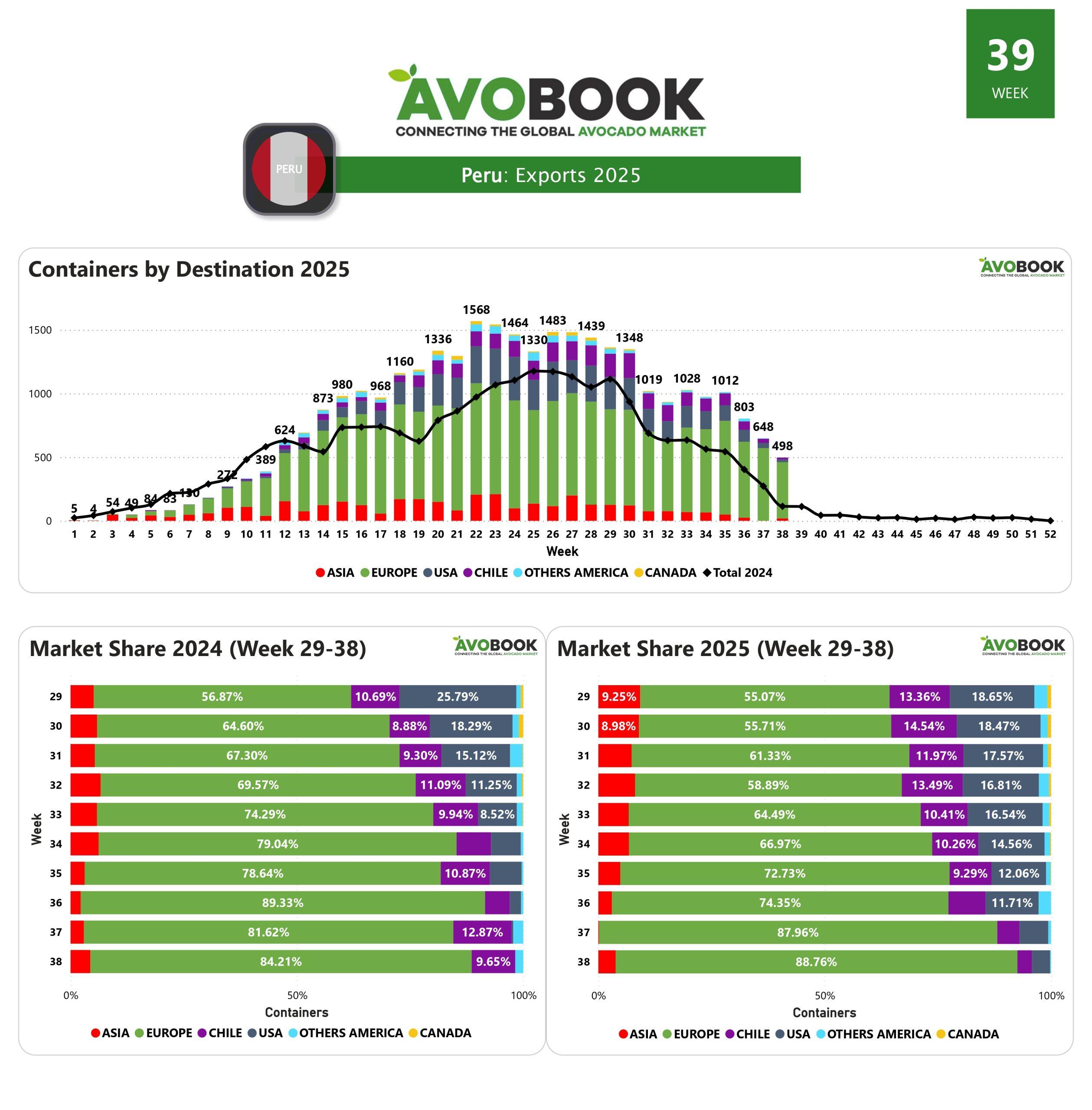 Perú un total de 498 contenedores de aguacate Hass, prácticamente 500, lo que representa una disminución del 23% frente a la semana anterior. Pese a este retroceso, el volumen se mantiene muy por encima del nivel alcanzado en la misma semana del año pasado, lo que confirma la fuerza de la campaña peruana en la recta final de la temporada.