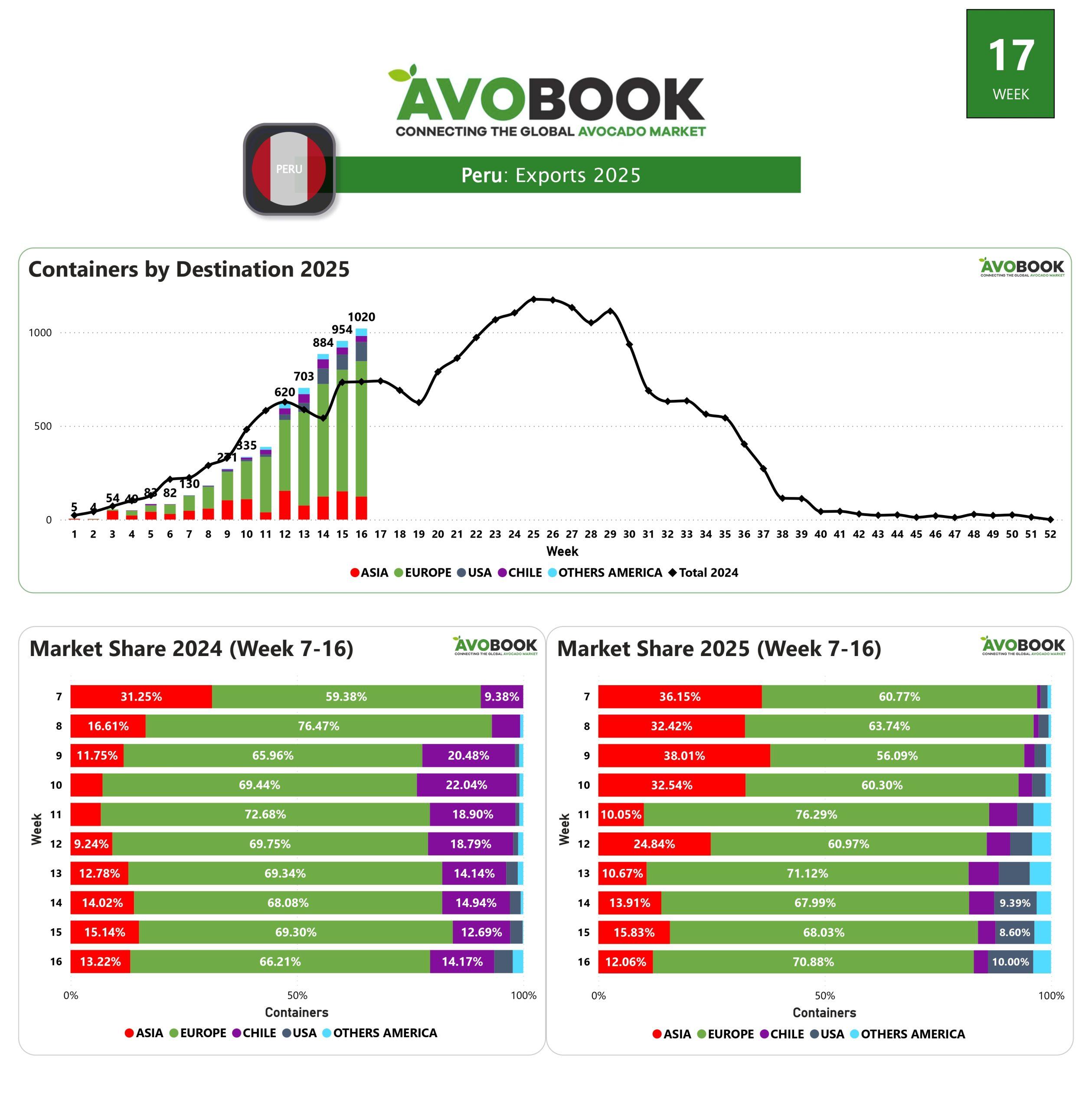 Durante la semana 17, Perú exportó 1.029 contenedores de aguacate, registrando un aumento del 6% en comparación con la semana anterior y un 40% más que en el mismo período del año pasado. El volumen alcanzado esta semana supera ampliamente los niveles históricos, considerando que en 2023 la marca de los 1.000 contenedores semanales se logró varias semanas más adelante, cerca de la mitad del año.