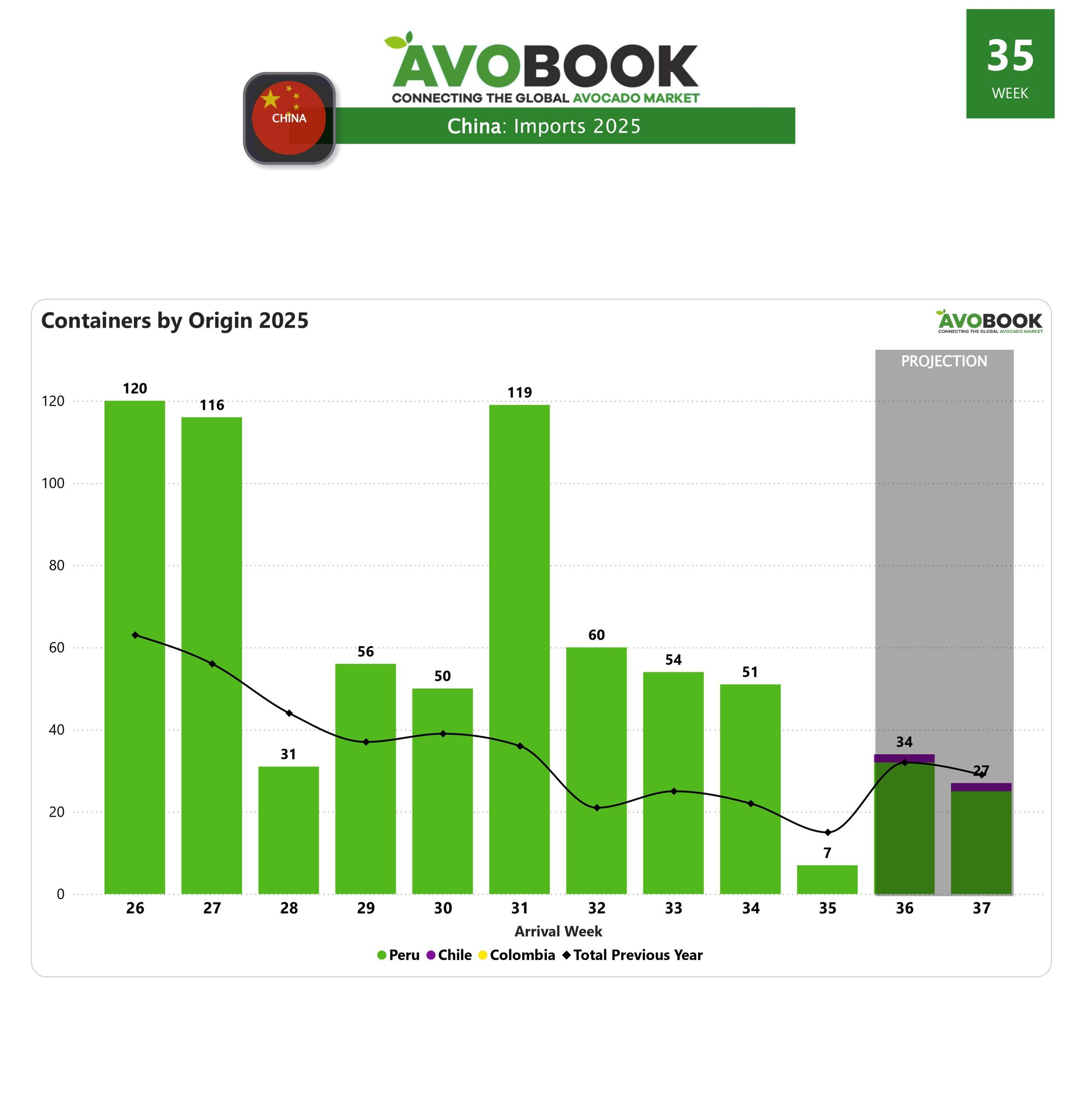 El mercado chino cerró la semana con apenas 7 llegadas de aguacate, una cifra inusualmente baja que responde en parte a retrasos portuarios, pero también al descenso natural de los envíos desde Perú, su principal abastecedor. Para poner en contexto, en la semana 34 los arribos superaban los 50 contenedores semanales, un nivel que se venía sosteniendo en semanas previas. Aunque se espera una normalización en los próximos días, las proyecciones no superan ese umbral, pues la campaña peruana ya entra en su fase descendente.