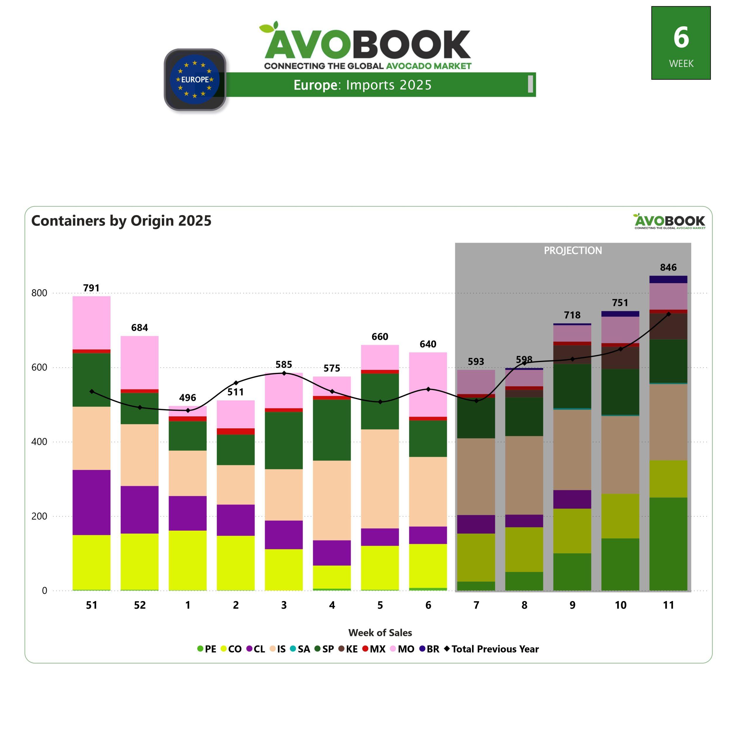 El mercado europeo cerró la semana 6 con un total de 640 contenedores importados, una cifra muy similar a la de la semana anterior. A pesar de esta estabilidad en el volumen general, la distribución por origen presentó algunas variaciones. Israel se consolidó como el principal proveedor, con un 29% del mercado, aunque sus envíos disminuyeron en casi 80 embarques respecto a la semana 5. Marruecos, con el 27% del mercado, sigue de cerca a Israel en términos de participación.