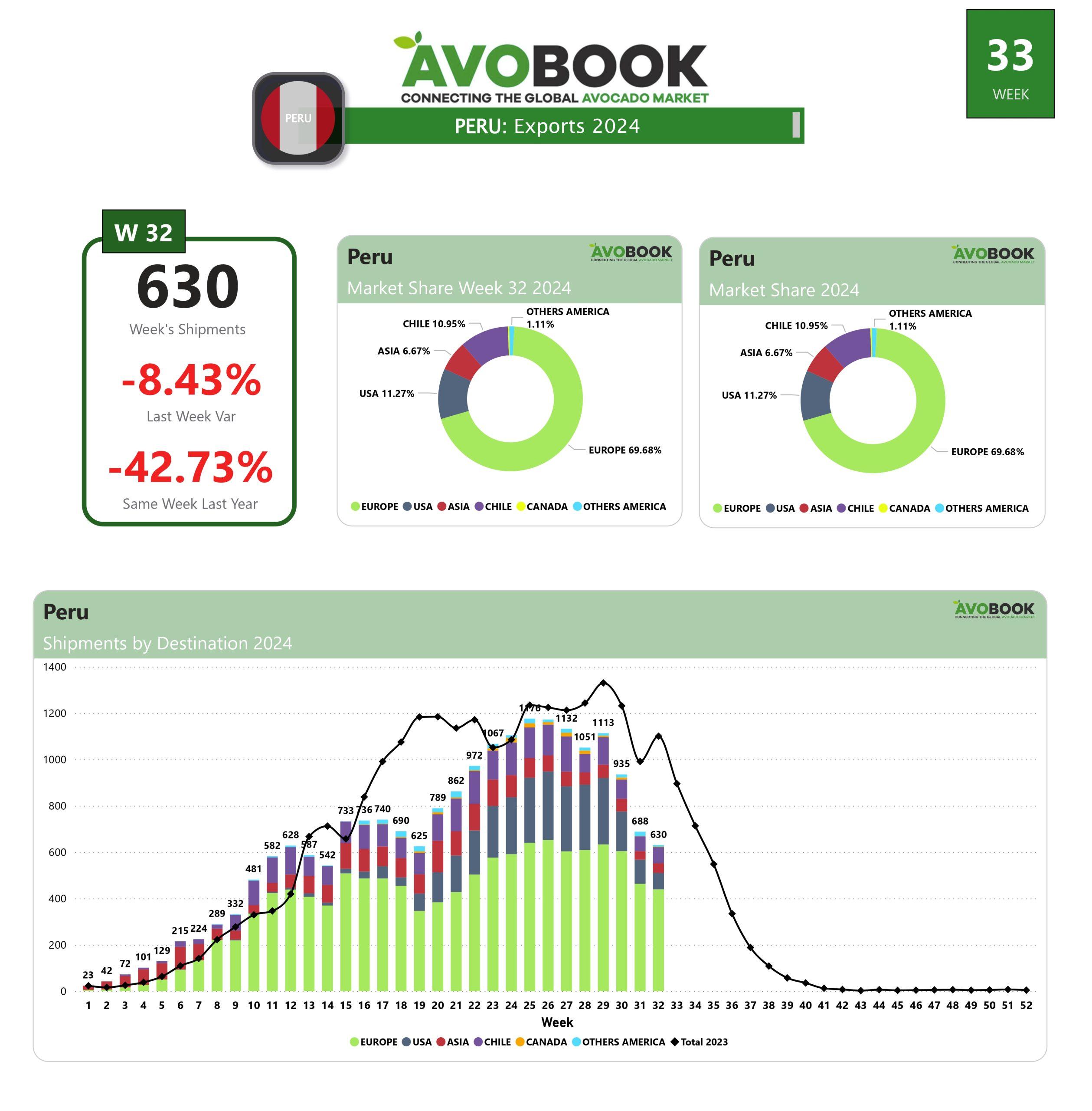Lo llamativo es que equivale a un 75% menos, en comparación a la semana 33 del del año anterior. Al parecer, las exportadoras están priorizando sus despachos a Europa, que parece tener mejores oportunidades, en un escenario de menor disponibilidad de fruta. Otro factor es que, en caso de Perú, se adelantó su retirada paulatina en comparación a la temporada anterior, lo que ha desfasado todo su calendario.