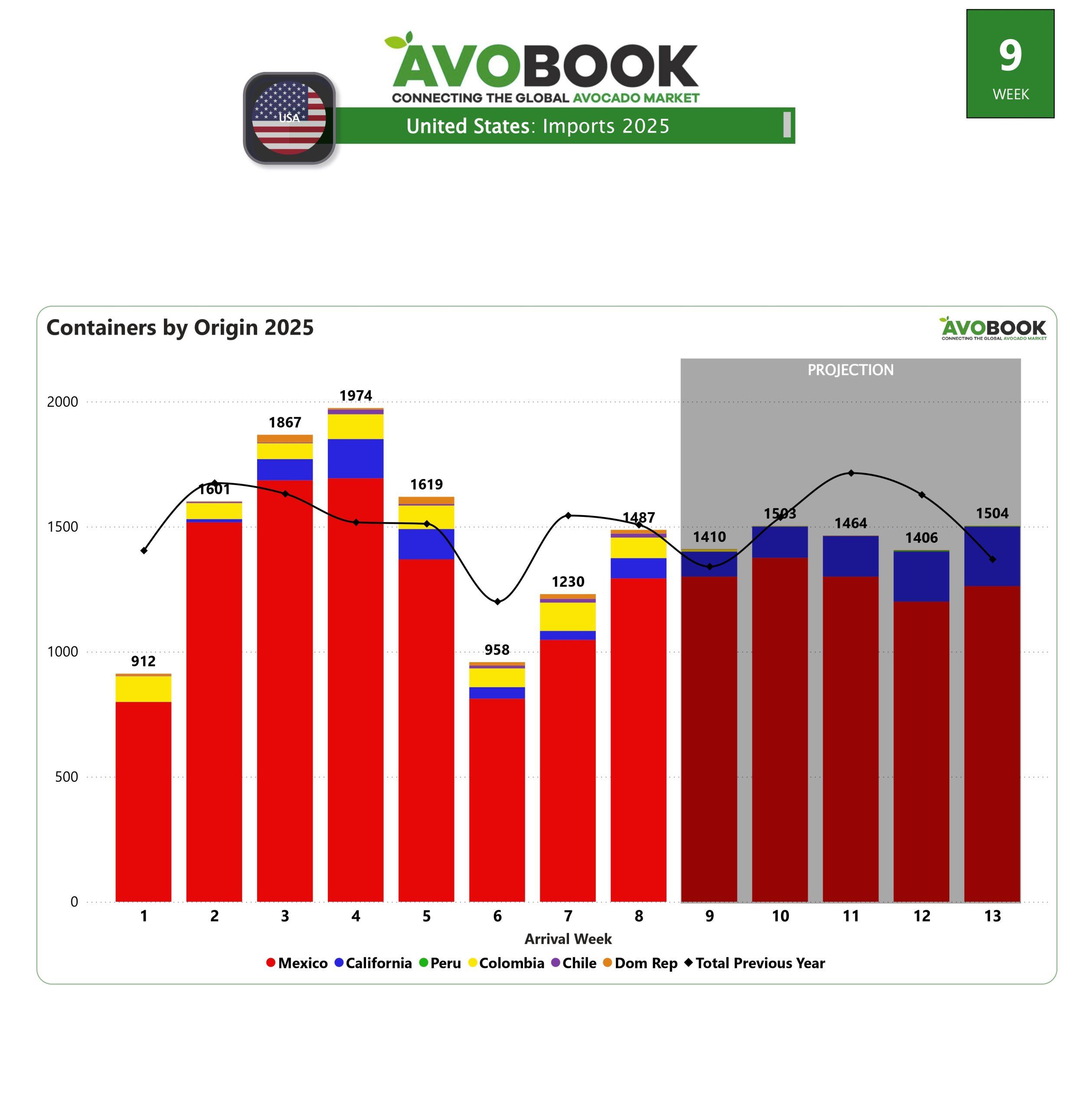 El mercado estadounidense cerró la octava semana del año con un aumento significativo en los volúmenes de importación de aguacate, alcanzando los 1,487 contenedores. Este incremento del 21% respecto a la semana anterior marca la segunda semana consecutiva de crecimiento, luego de la baja registrada en la semana 6, una fluctuación esperada debido al Super Bowl. En comparación con el año pasado, el volumen es prácticamente el mismo, con solo un 1% de diferencia.