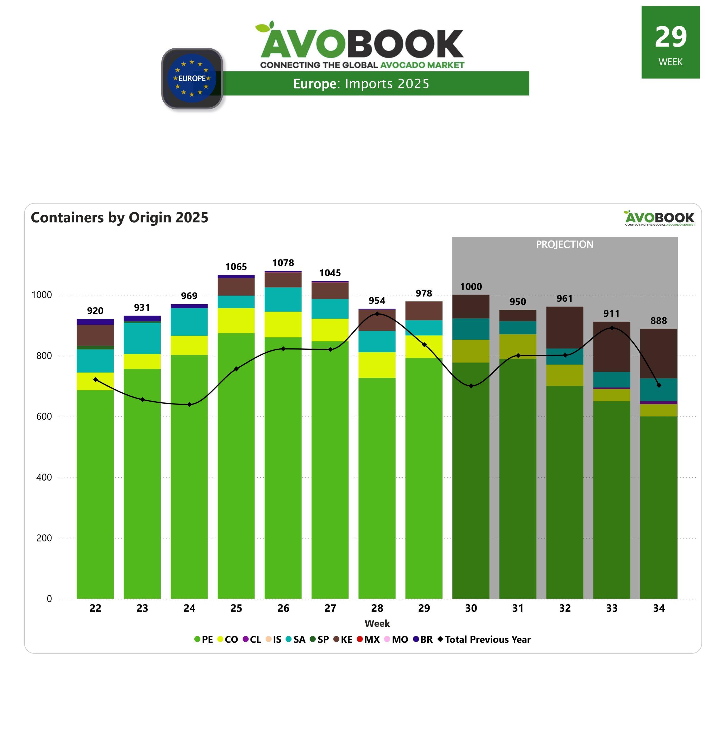 Durante la semana 29, el mercado europeo de aguacate registró la llegada de aproximadamente 978 contenedores, lo que representa un crecimiento del 3% en comparación con la semana anterior y un aumento significativo del 17% frente al mismo período del año pasado. Este avance consolida una tendencia positiva en el abastecimiento, con Perú liderando de forma contundente al representar el 81% del volumen total recibido.