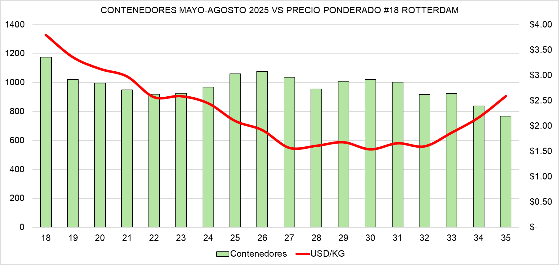En 2025, el precio comenzó a descender desde la semana 18, reflejando un mercado que ya estaba altamente abastecido. La baja se acentuó durante el tramo central de la campaña y alcanzó su punto más bajo al inicio del segundo semestre, coincidiendo con el periodo de mayor concentración de arribos al puerto de Rotterdam.